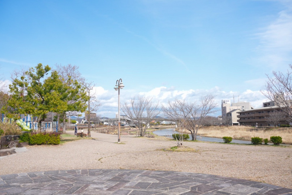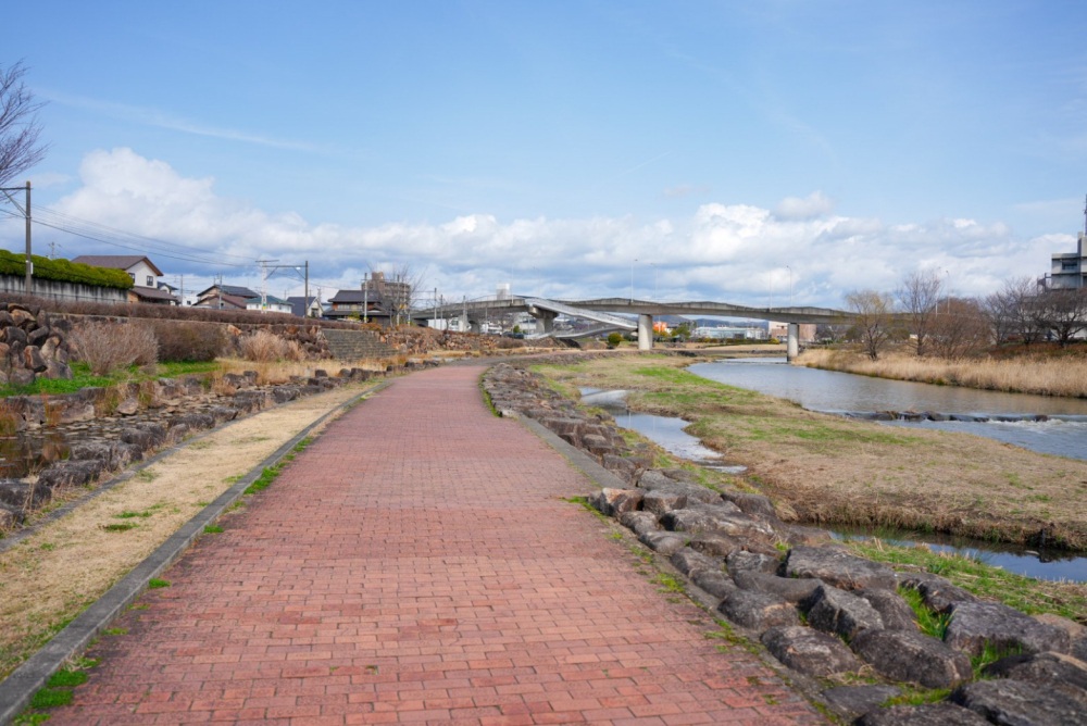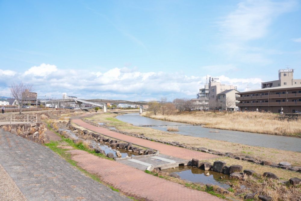 ふるさと川公園では、可児川沿いの見晴らしの良い風景を眺めながら散策を楽しめます。川や遊具などもあるので、お子さんと一緒に遊んだりペットと過ごしたりできる場所でもあります。
