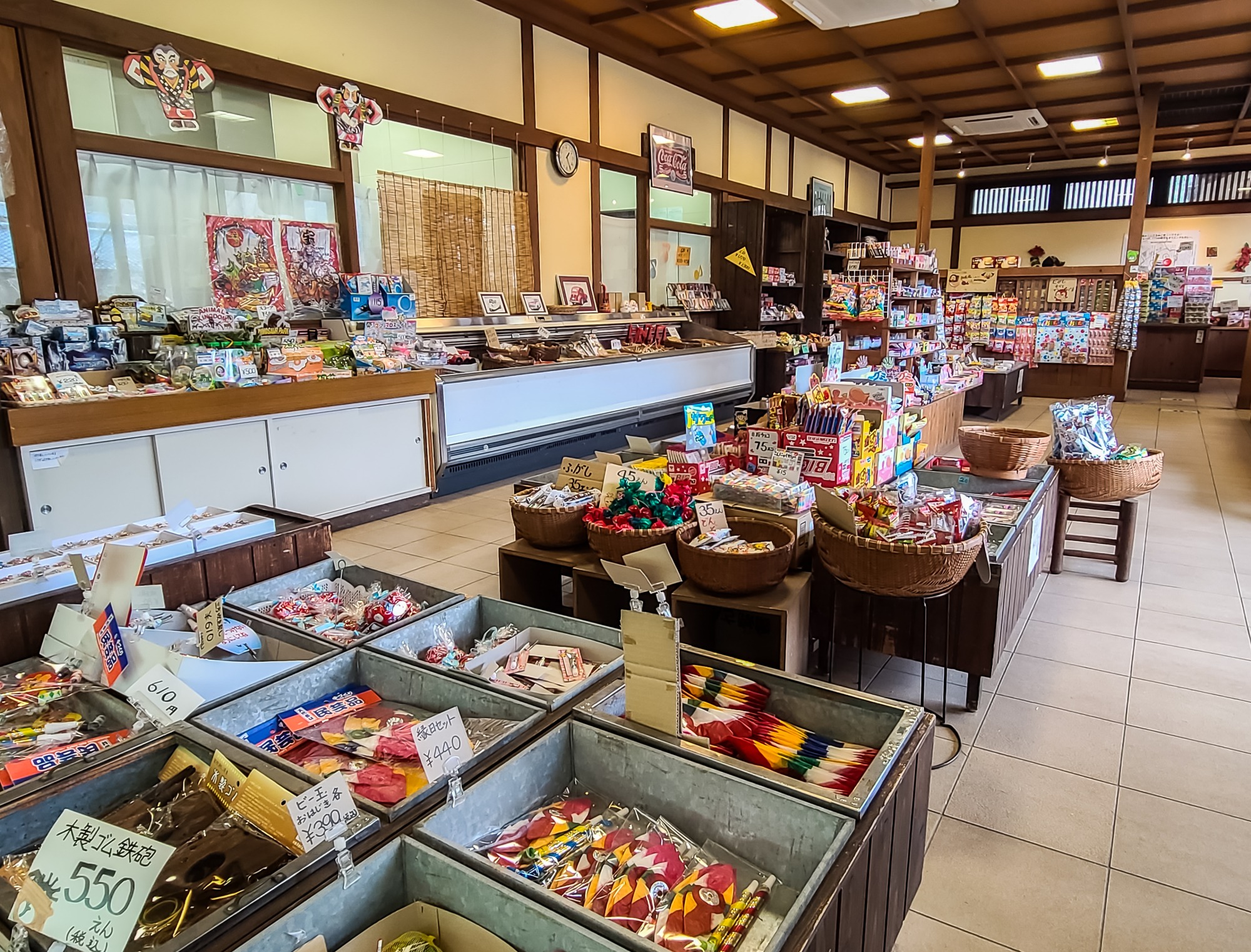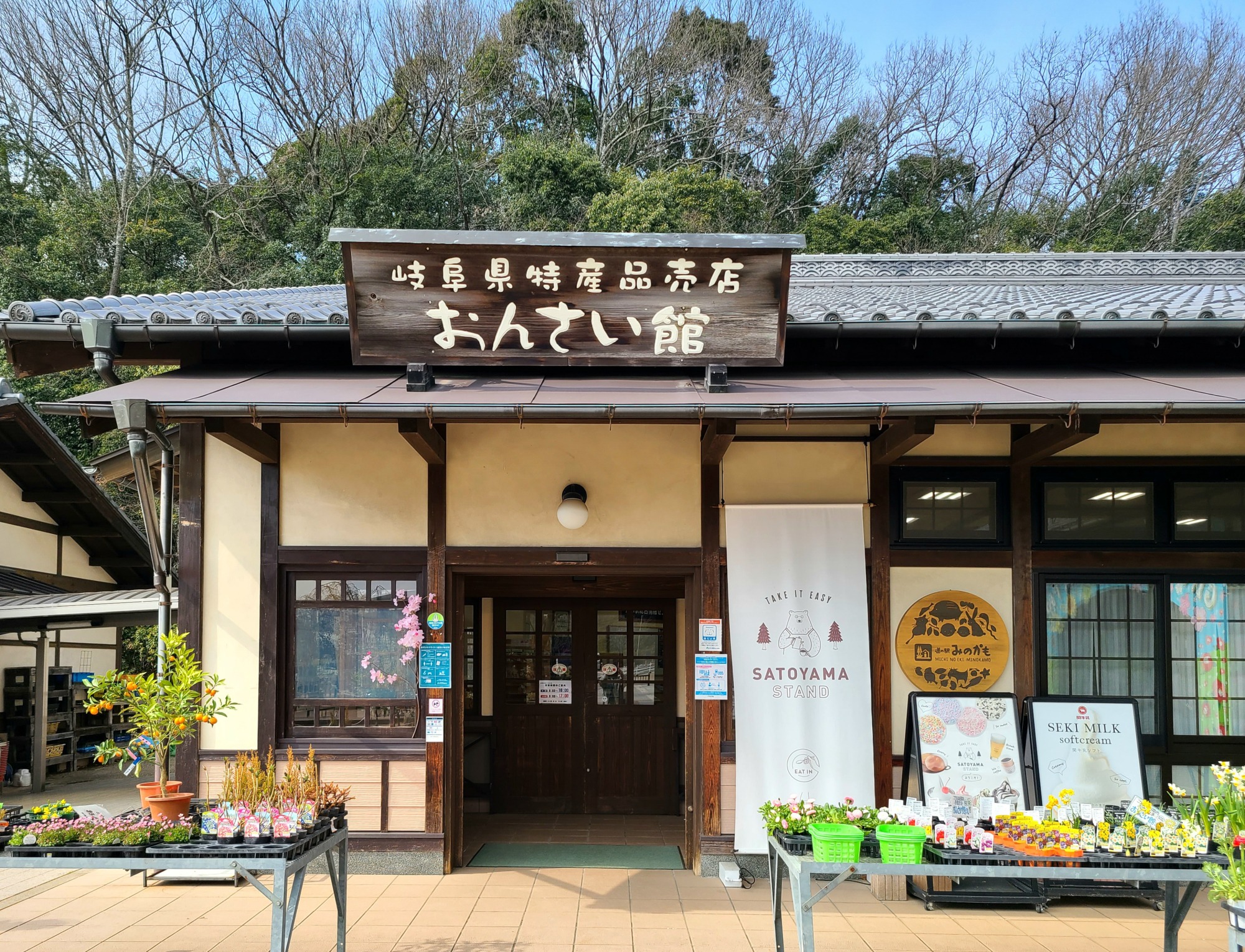 正面ゲートの近くにある「おんさい館」では、明宝ハムや飛騨牛カレー、高山ラーメンのほか、五平餅、八百津せんべい、さるぼぼなど、岐阜県特産品やお土産が幅広く取り揃えられています。