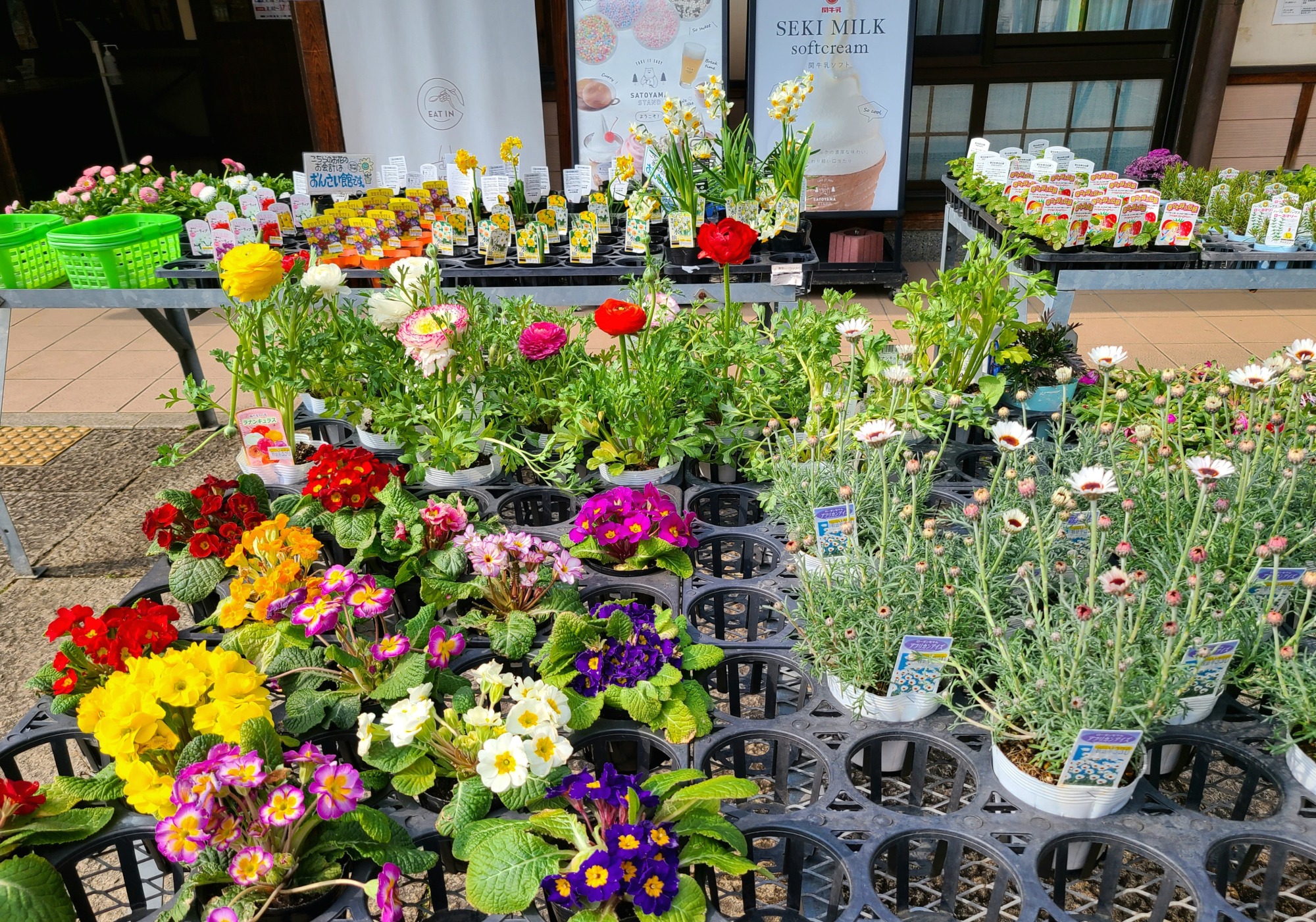 お店の入り口付近では、花の苗も販売されています。色とりどりの花がキレイに並んでいました。