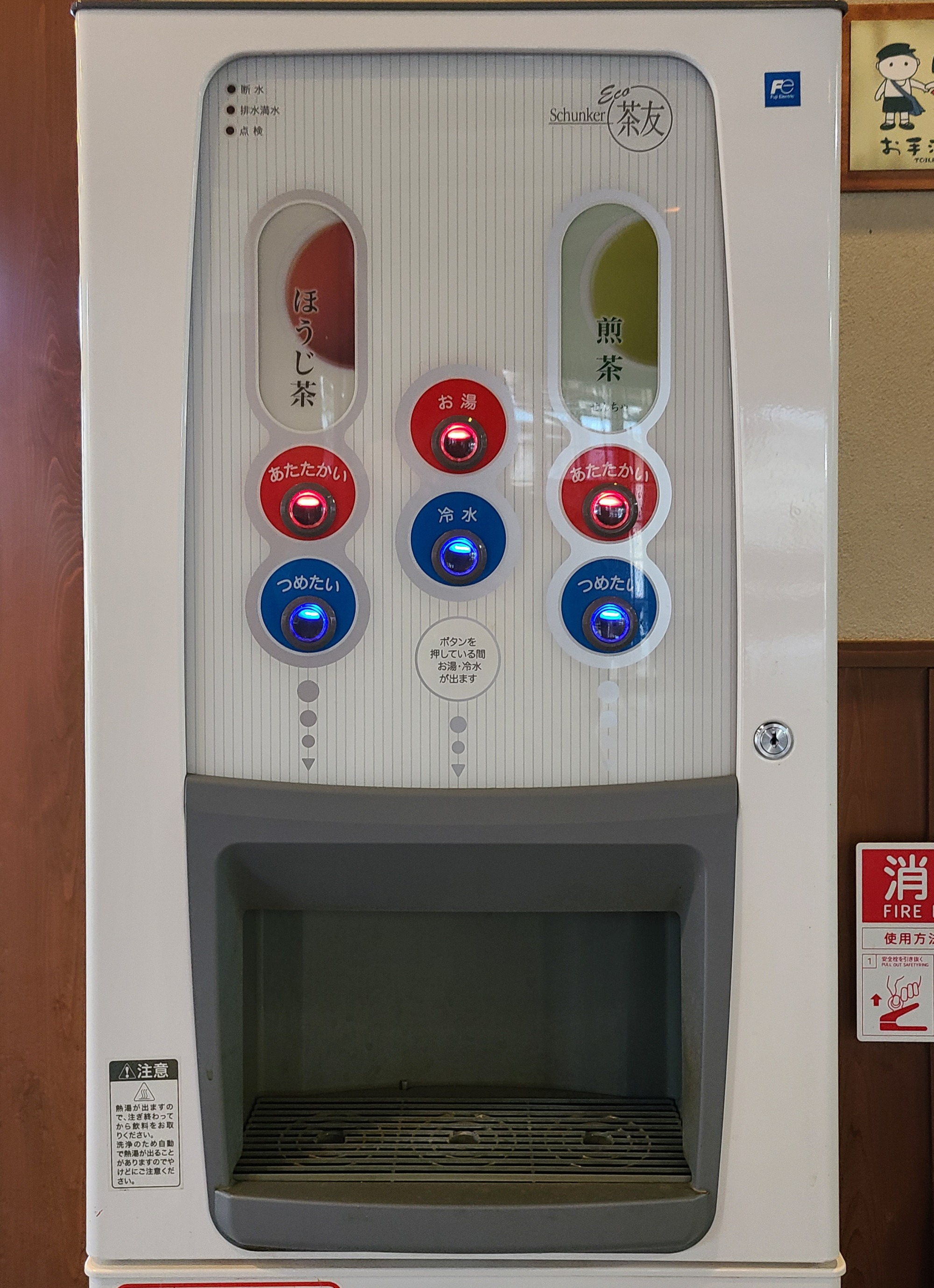 給茶機が設置されているので、ほうじ茶、煎茶が無料でいただけます。