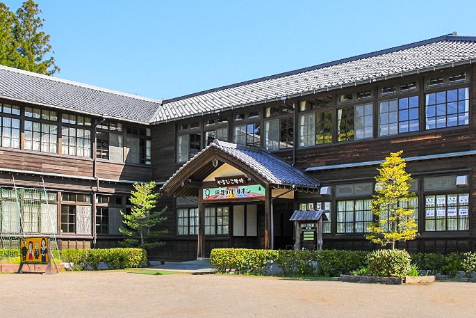 「やまびこ学校」は、岐阜県旧大野郡宮村から移築・整備された木造2階建ての宮小学校の旧校舎を利用した施設。