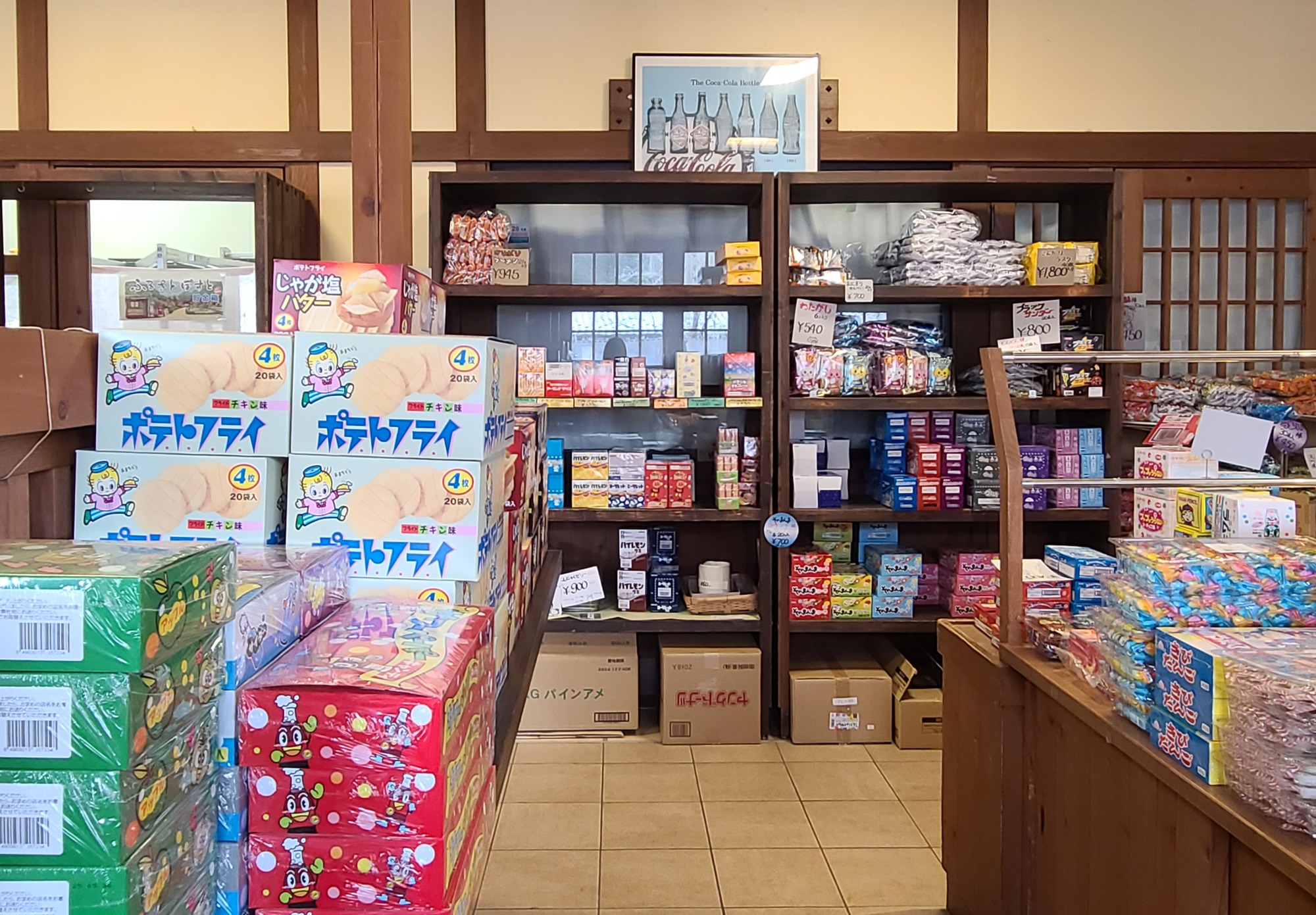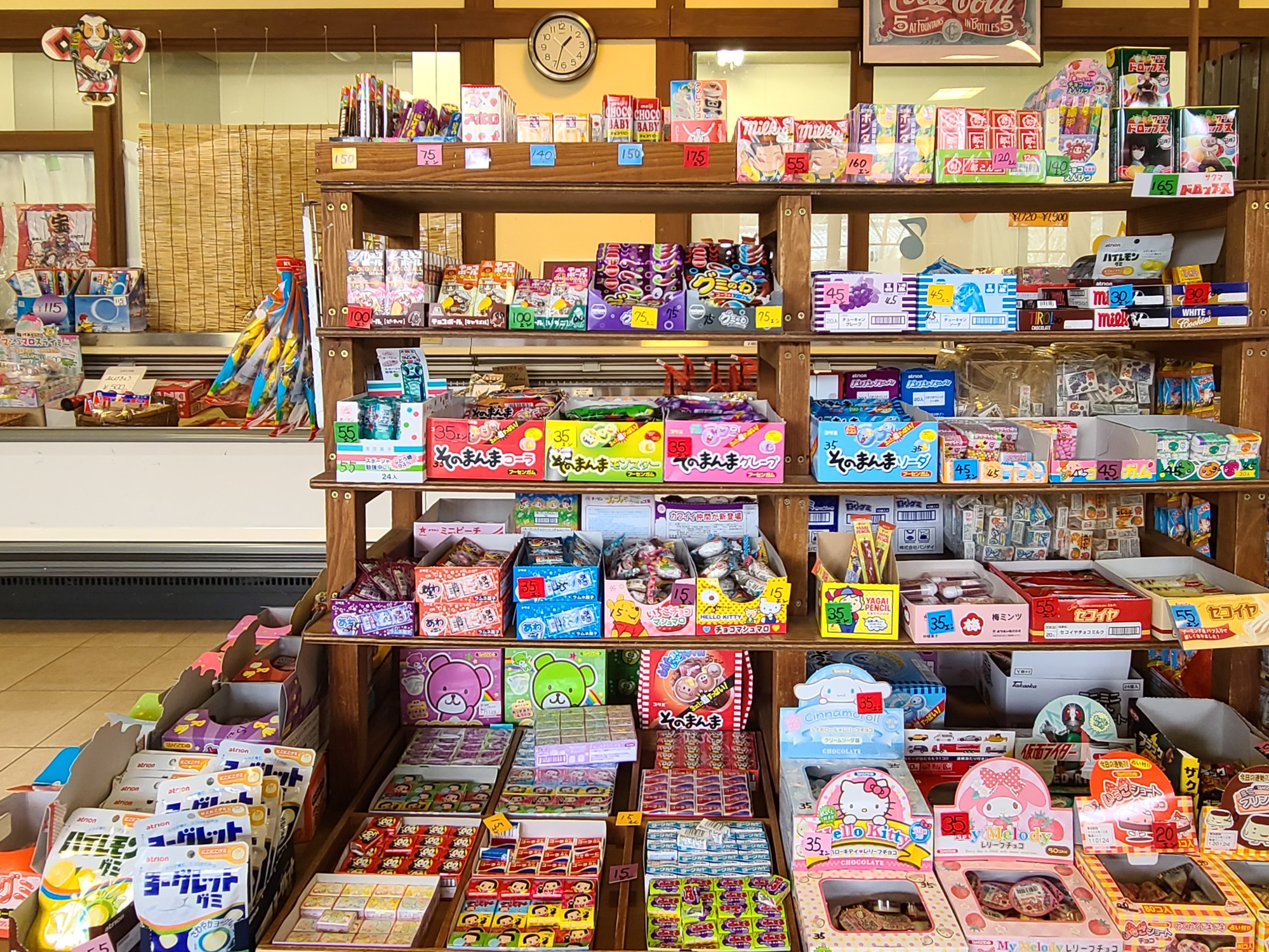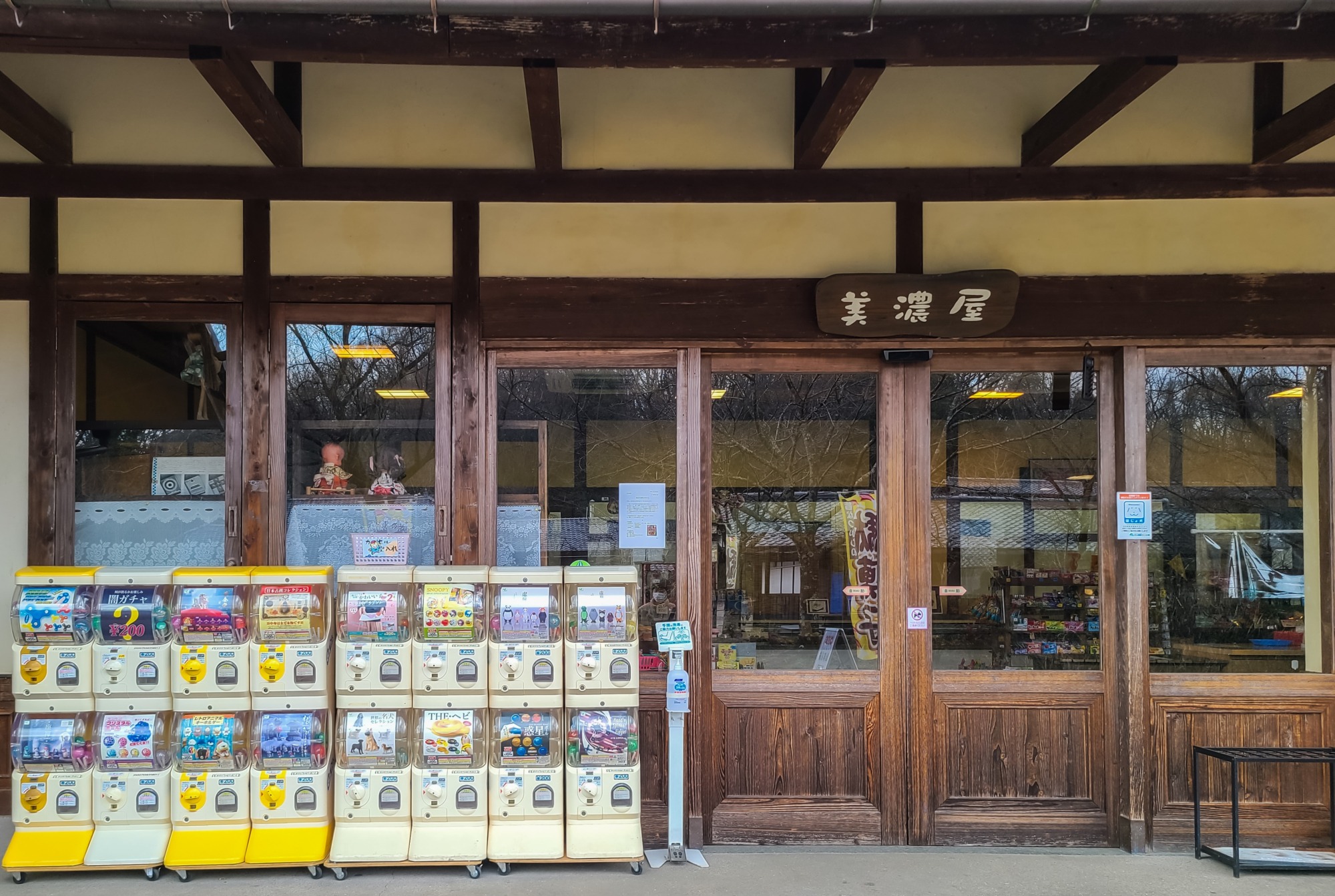 懐かしい駄菓子が購入できる「美濃屋」。レトロな店舗の入り口には、ガチャガチャコーナーもあります。店内にズラリと駄菓子が並んでいるのが見えて入る前からワクワクします。