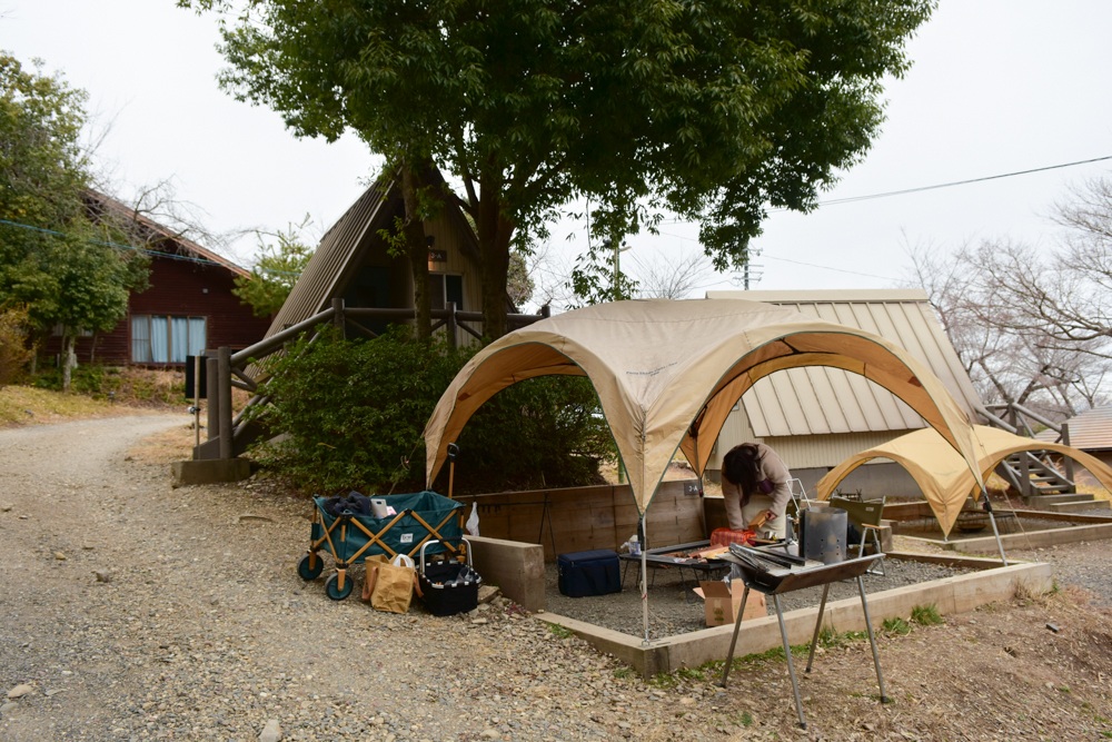 BBQコンロや焚き火台などはあらかじめセットされており、タープも各ロッジの前に貼ってあるので、女性同士やキャンプ初心者でも比較的簡単に用意することができます。もし炭や薪が足りなくなったら管理棟へ。売店で様々なグッズを購入できるのも嬉しいポイントです。