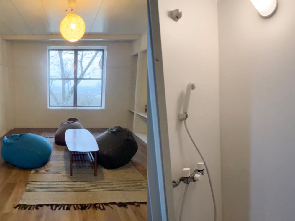 管理棟には綺麗なシャワーブースやトイレもあるので、女性でも安心して宿泊可能です。また同棟の中にはヨギボーなどが置かれたくつろぎスペースもあるので、シャワー後にここで語らうのもありです。