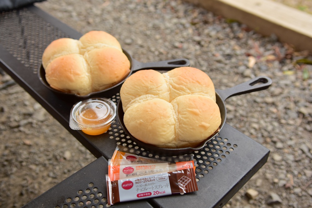「RECAMP養老」ではモーニングサービスとして、地元で有名なパンのお店「ル・ルパン・ブルー」のちぎりパンを各サイトまで持ってきてもらえます。スキレットに入ったちぎりパンはBBQコンロで少し温めるとおいしさが倍増。朝からお腹が満たされます。