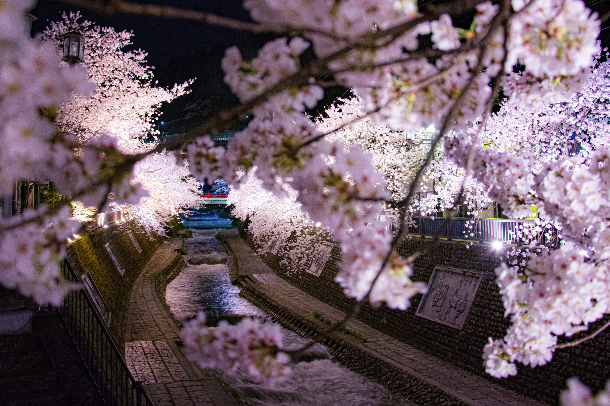特に夜のライトアップ時に見ていただきたい飛騨市神岡町「山田川沿いの桜」。