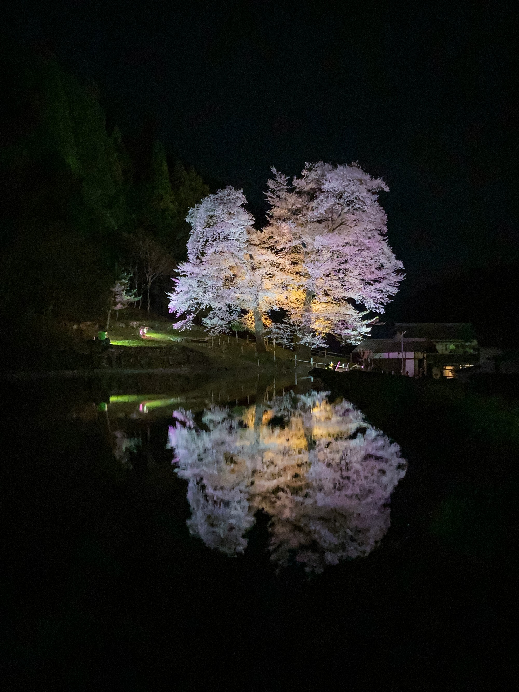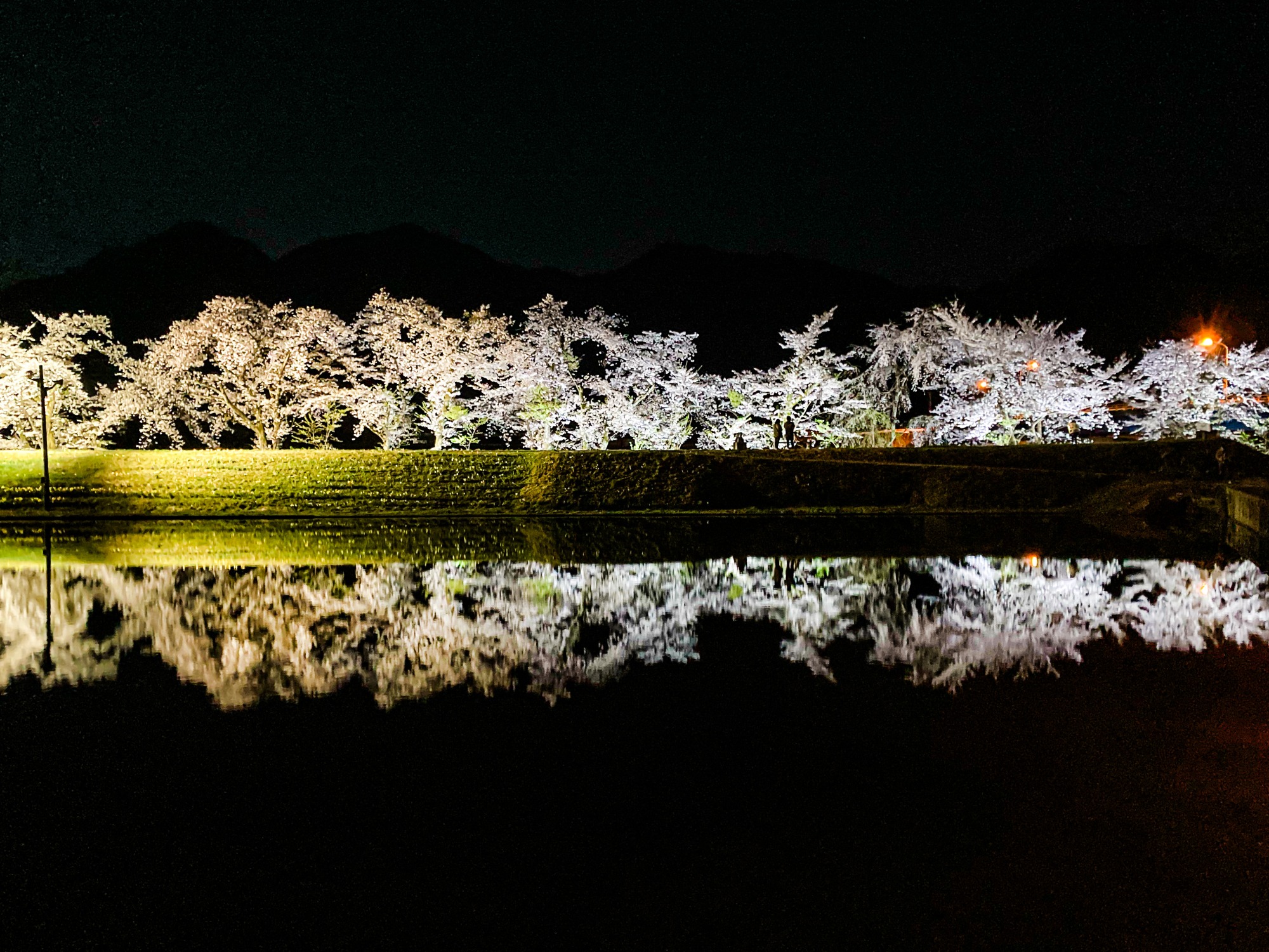 こちらはライトアップ時の御所桜です。水を張った田んぼの水面に映る「桜鏡」と呼ばれる美しい逆さの桜並木が見どころです。