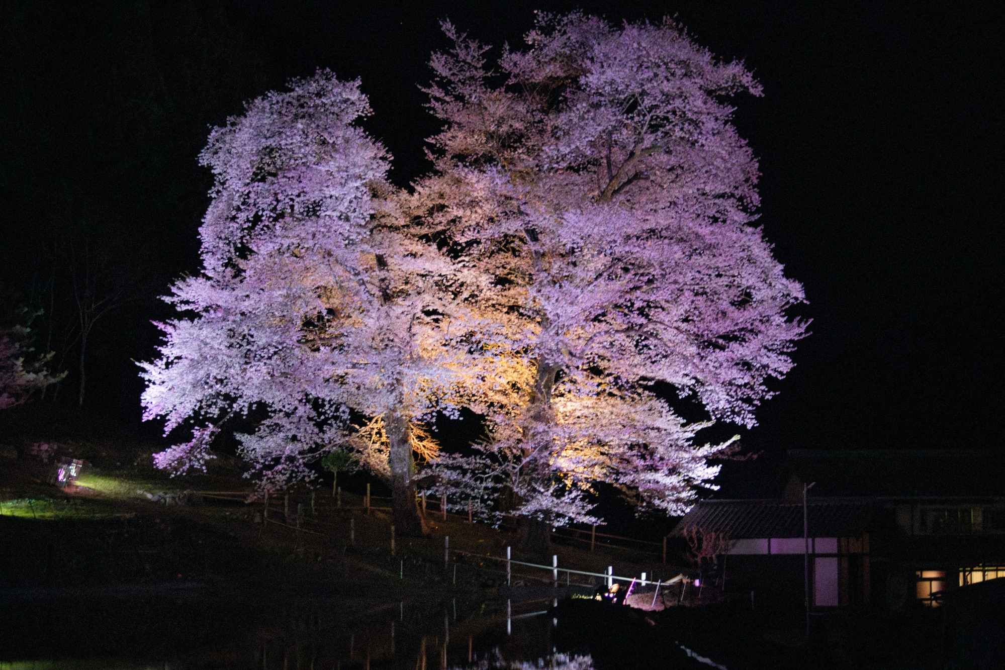 苗代桜の手前の田んぼには開花時期になると水が張られ、ライトアップされた桜が逆さに浮かび上がる姿は幻想的で、田んぼ手前側は人気の撮影スポットとなっています。ぜひゆったりと春のひとときをお楽しみください。