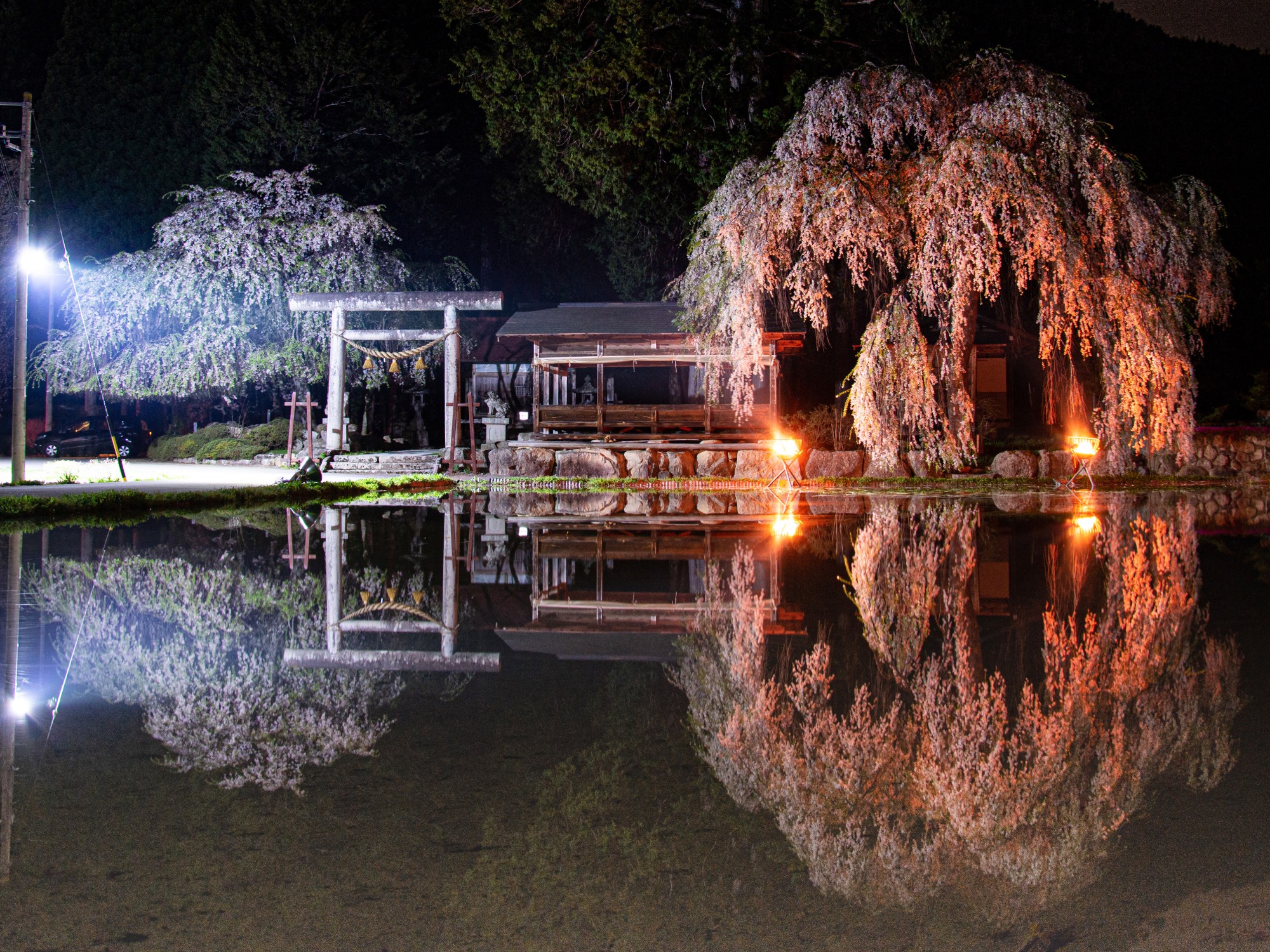 開花時期になると神社前の田んぼに水が張られ、水面に映る逆さのしだれ桜が見られる絶景スポットになります。