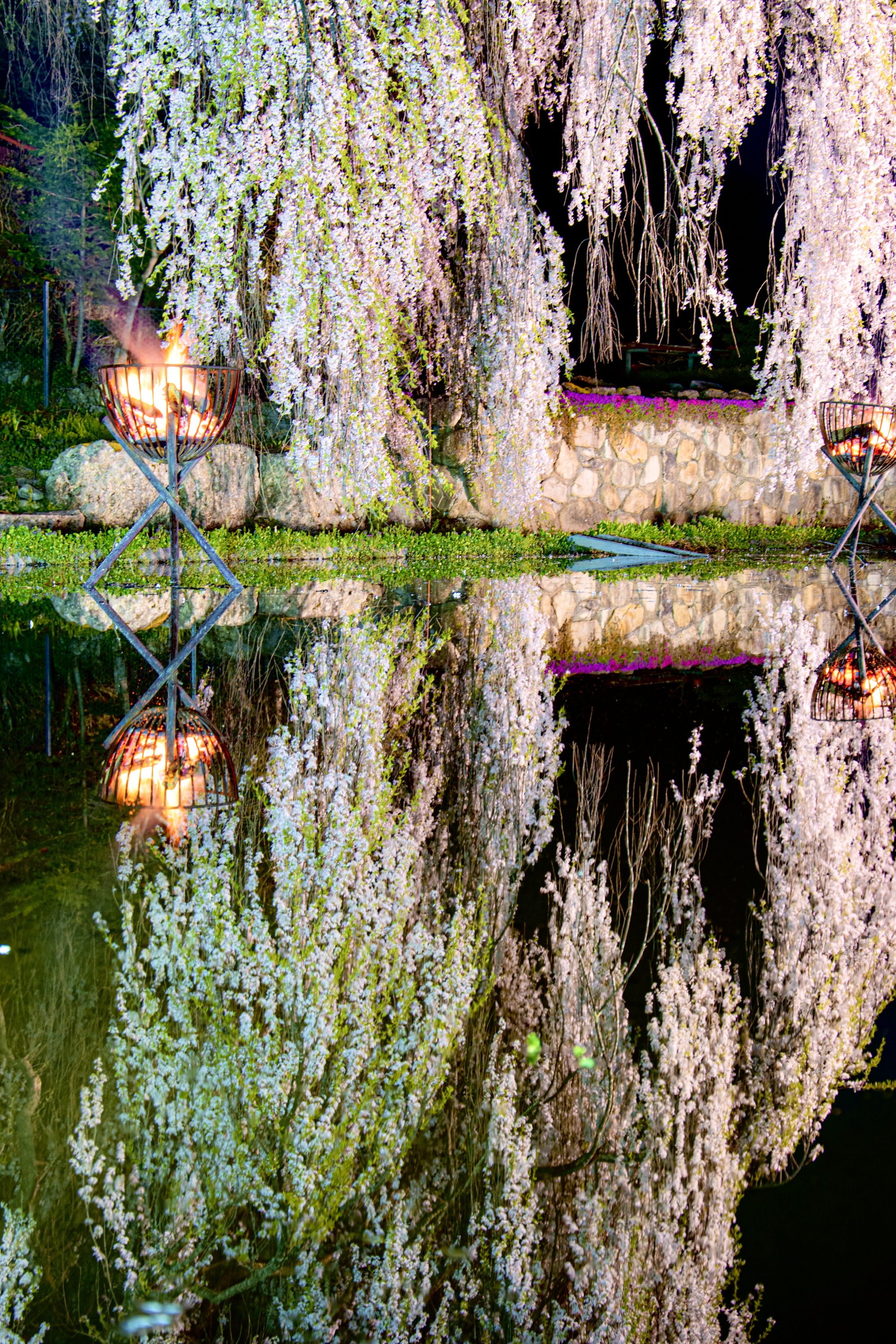 特別に篝火(かがりび)によるライトアップを行う日があるようで、その日のしだれ桜はより柔らかな光に包まれて輝いていました(個人の感想です)。