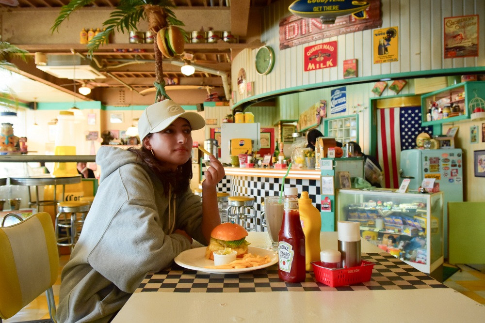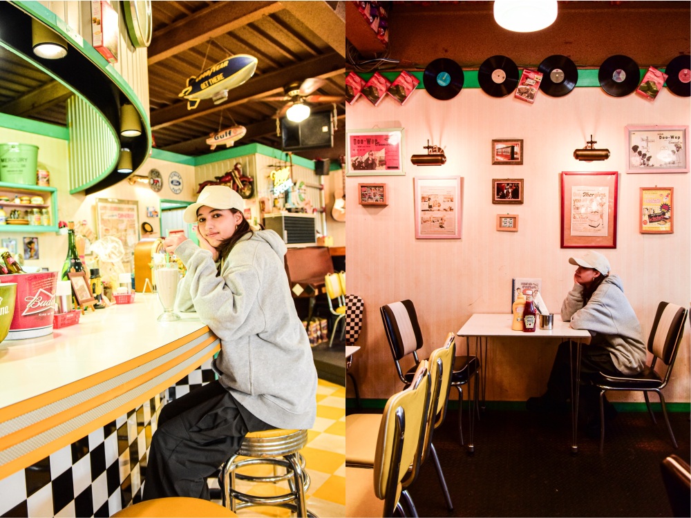 店内はまるで往年のアメリカのムービーのような世界。アメリカのナンバープレートや黄色いソファー席、ディスプレイなどどこを切り取っても写真映え必至です。