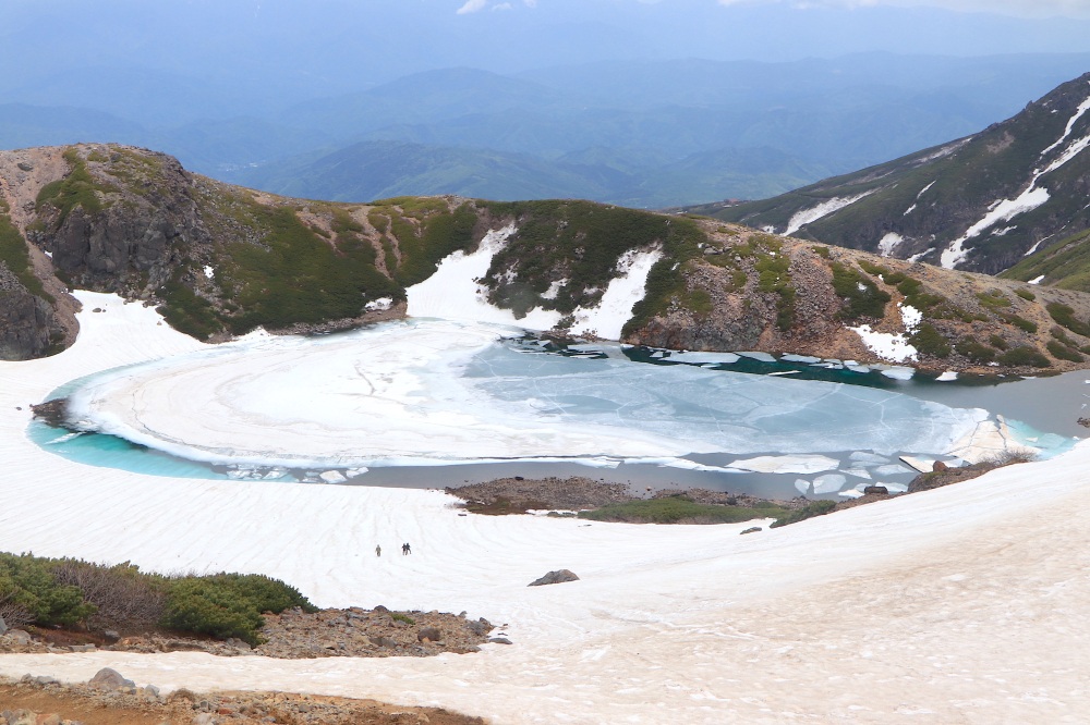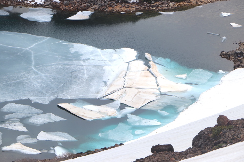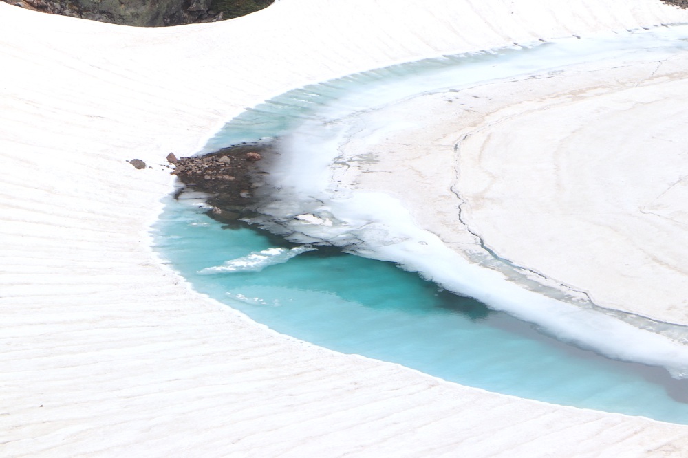 少しずつ割れた雪塊が一つひとつ沈下し、その場所から美しい水色に染まっていく光景は、言葉にできない美しさです。三ノ池には一周の登山道が整備されており、ドラゴンアイの周囲を歩くこともできます。