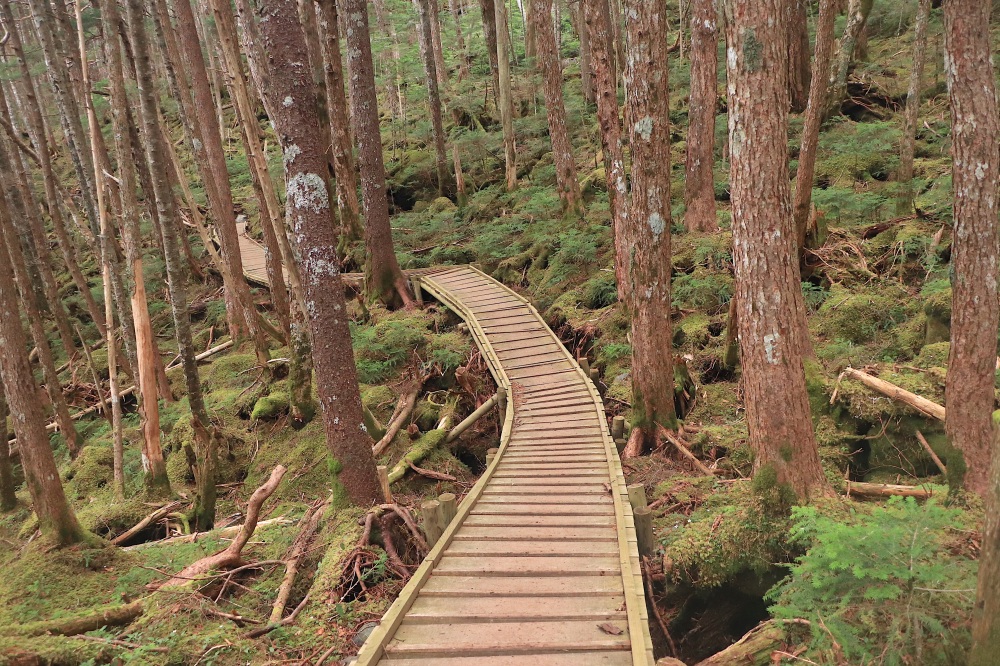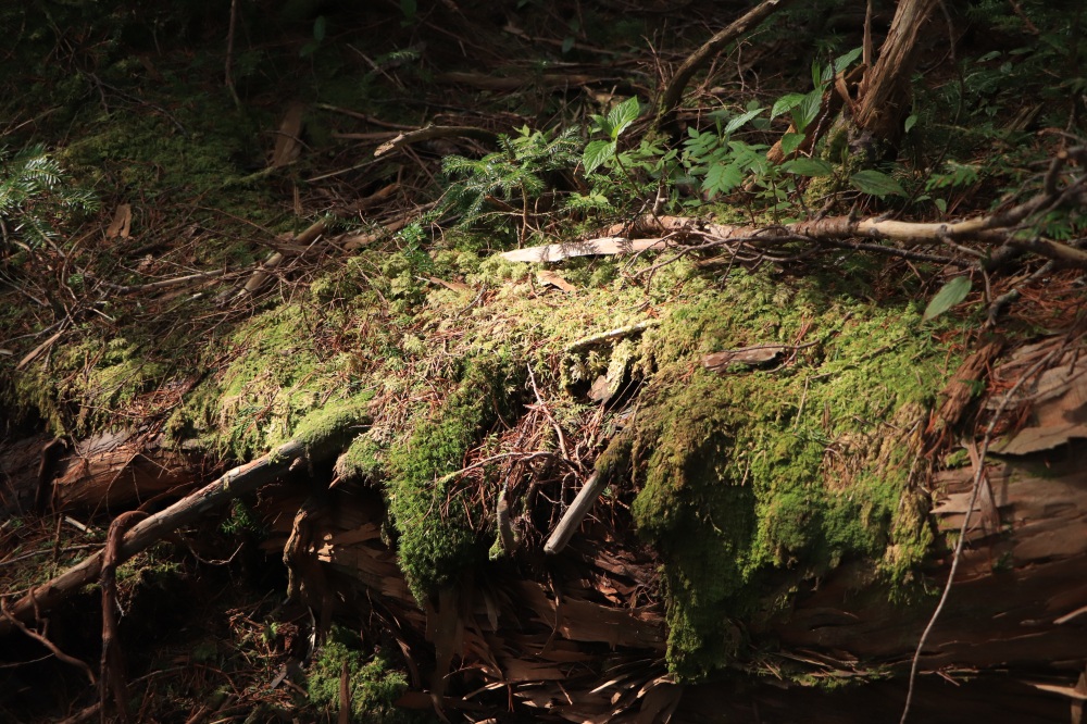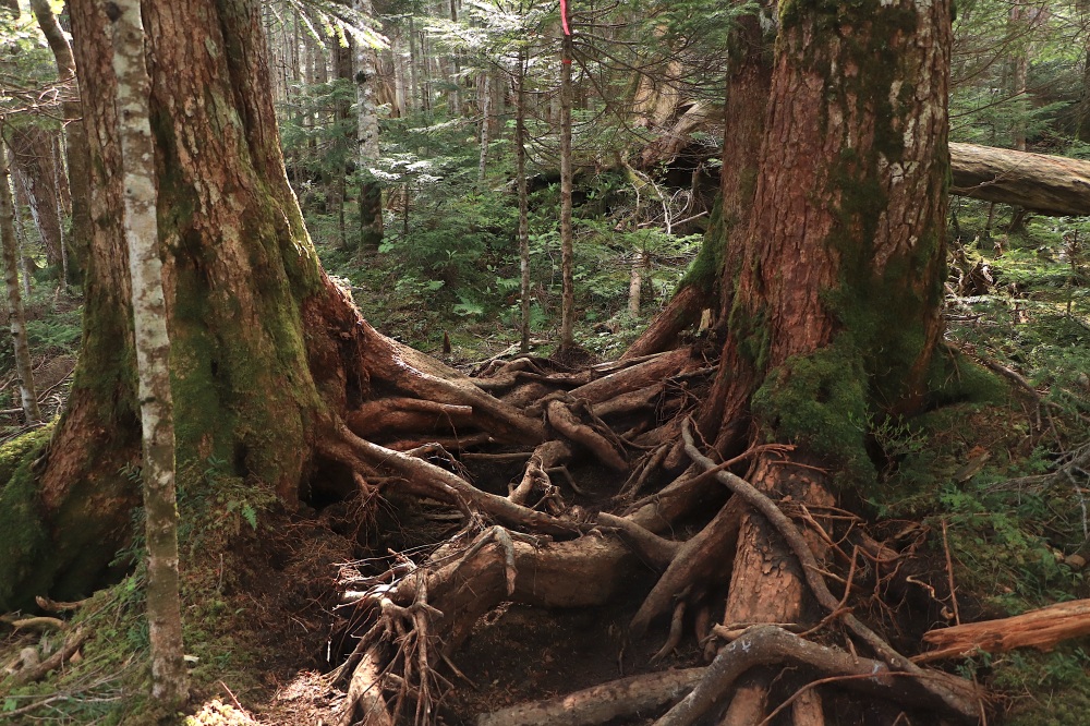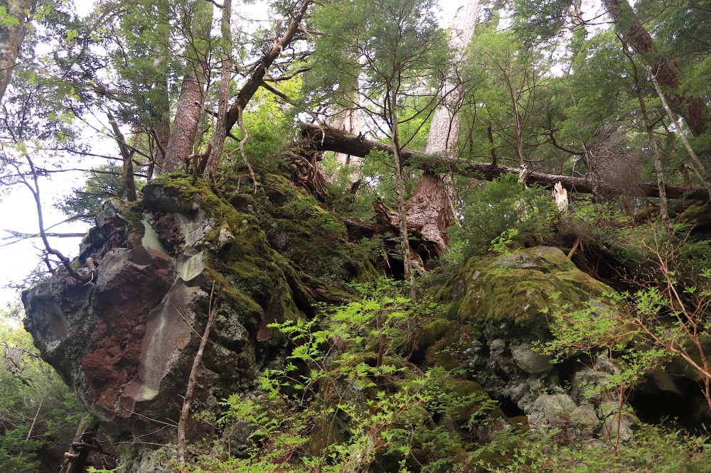 前半は、苔むした手付かずの原生林のなかを進んでいきます。道もなだらかで歩きやすく、ところどころ巨大な岩を掴むように、根を張り巡らせている大樹の姿が印象的です。火山噴火の後に、種が岩の上に落ち、森が育まれたことがよく分かります。