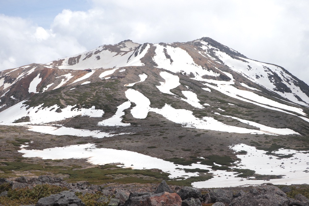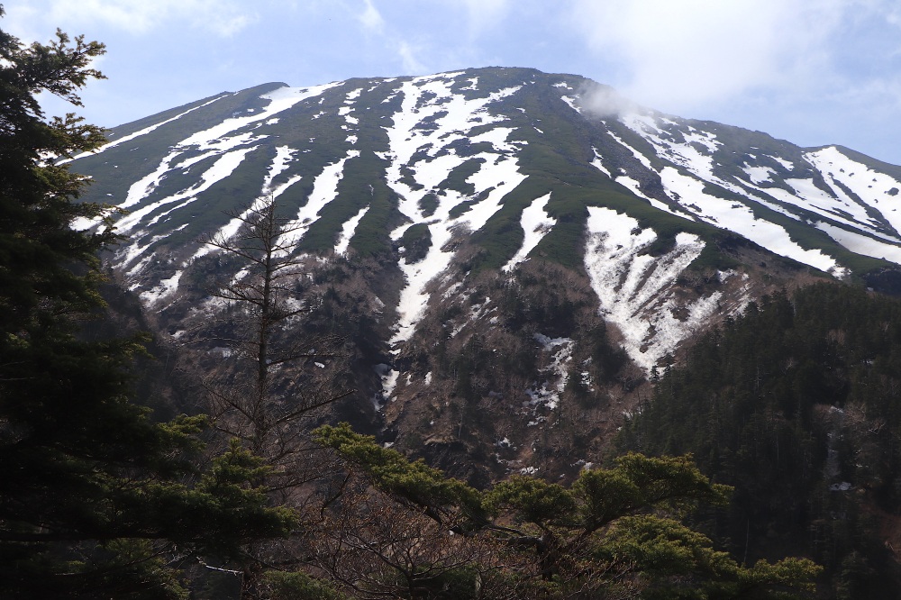 摩利支天乗越という分岐を過ぎると、火山らしいゴツゴツとした岩稜帯が続いていきます。左手に目をやると、残雪と火山地形が織りなす、荒々しくも神秘的な御嶽山上の世界が広がっていました。この時期しか見られないゼブラ色の山体に目を奪われます。