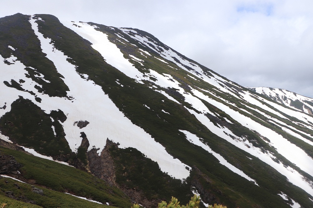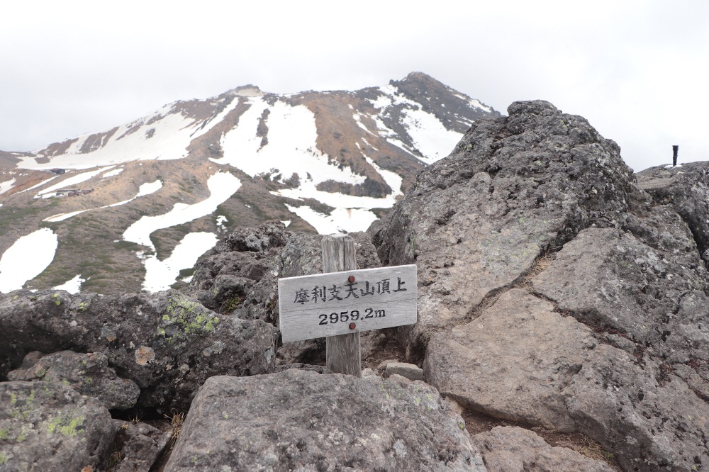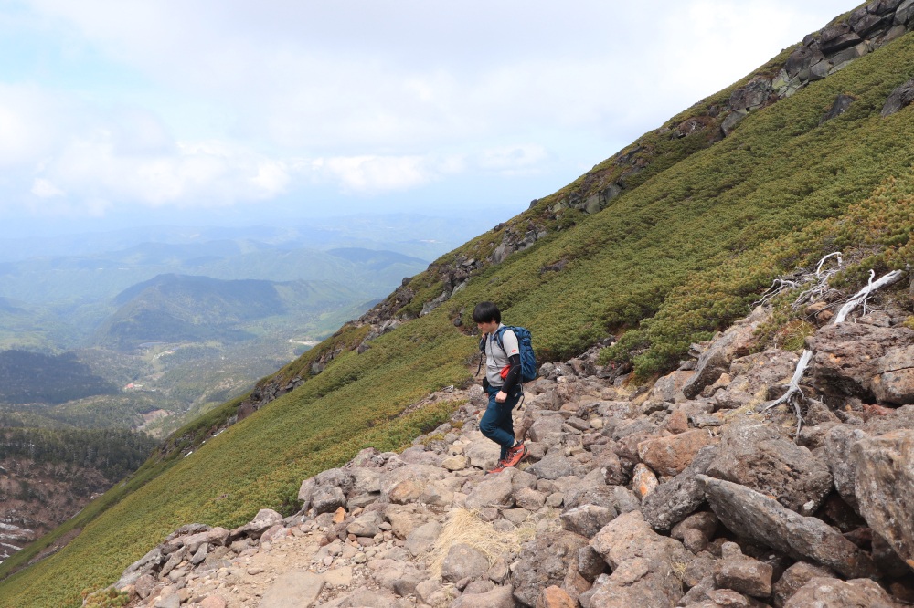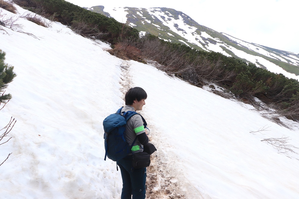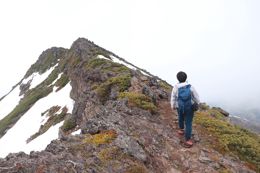 そして少しスリリングな稜線をつたって山頂へ。途中、どこが正規ルートか分からなくなり、残雪の方へ行ってしまう可能性がありますが、そのまま進むと滑落のリスクが上がるので注意が必要です。
