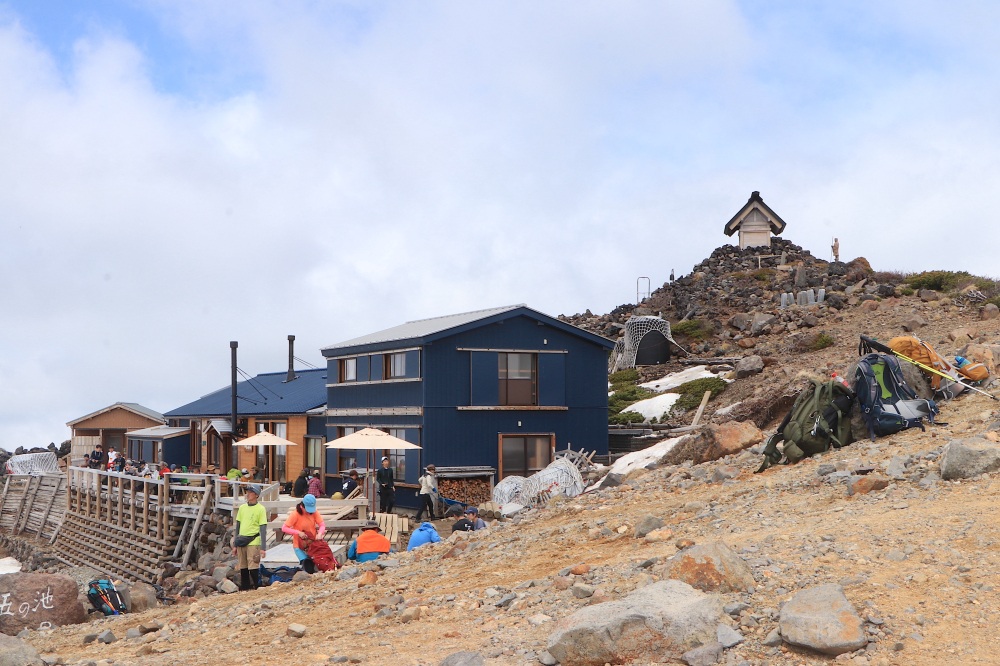 トラバース区間を登り終え、「五の池小屋」へ。御嶽山頂の周辺にある山小屋の一つで、ドラゴンアイが見頃を迎えるシーズンには多くの登山愛好家で賑わっています。五の池小屋の隣には「飛騨頂上(標高2,811m)」の山頂があるので、ぜひ立ち寄ってピークハント(山頂を踏むこと)しておきましょう。