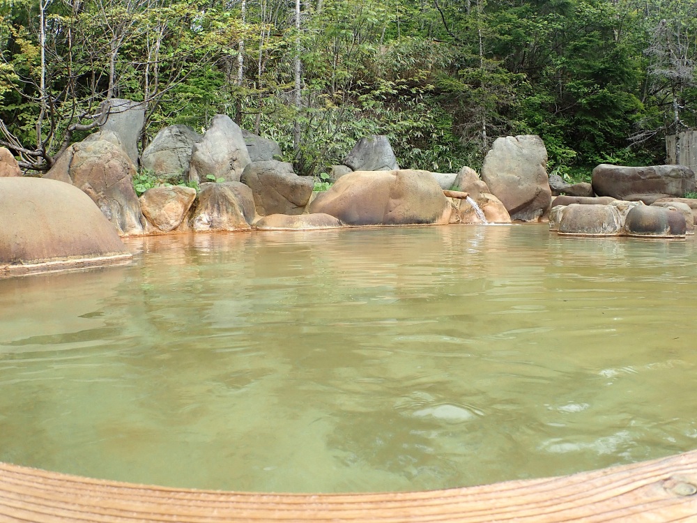 露天風呂のみの浴槽はかなり広く、泉質は三大美人泉質の一つに数えられる炭酸水素塩泉 (ナトリウム・カルシウム-炭酸水素塩・硫酸塩温泉)で、ドバドバと源泉掛け流しで供給されています。原生林に囲まれる非日常なロケーションで、泉質抜群のお湯で癒されることができますよ。