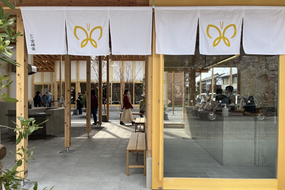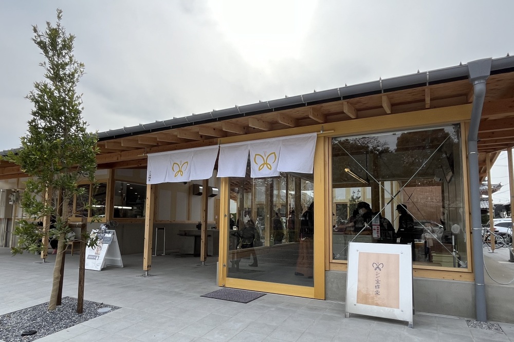 隣には、菓子工房もあります。新しくなったロゴマークには金の蝶が羽ばたいています。