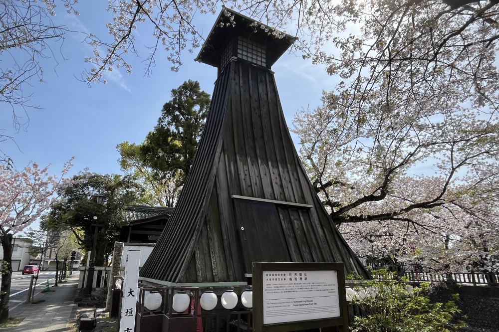 周辺には、船町湊に立つ松尾芭蕉と谷木因の像や句碑、住吉灯台など、水運で栄えた往事がしのばれます。
