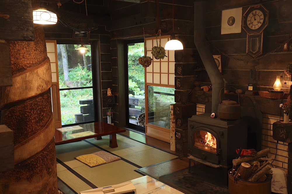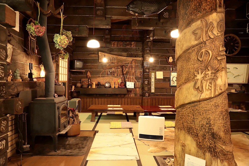 一本の倒木に丸ごと彫りを入れた彫刻作品となった梁や、廃線の枕木を利用した壁や天井がユニーク。年間を通じて冷涼な山奥にあるため、春や秋でも薪ストーブが焚かれています。外を眺めれば、鮮やかな緑とコンコンと流れていく清流。