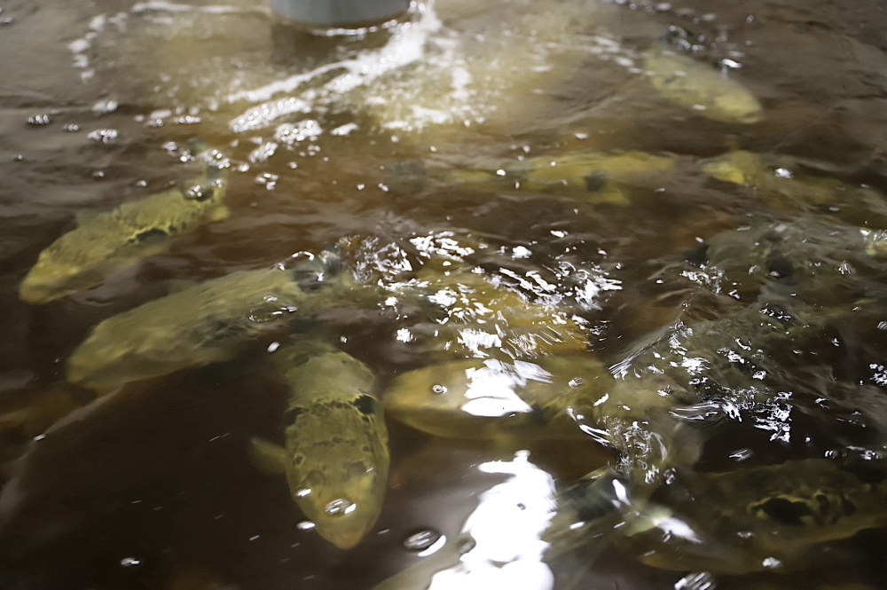 食後にお店の方へ一声かけると、もし空いていれば店主さんが飛騨とらふぐの養殖所を案内してくださいます。宇津江四十八滝から流れる清らかな水の中で、スイスイ泳ぐ姿は元気いっぱい。またふぐの表情はどこか愛嬌があります。