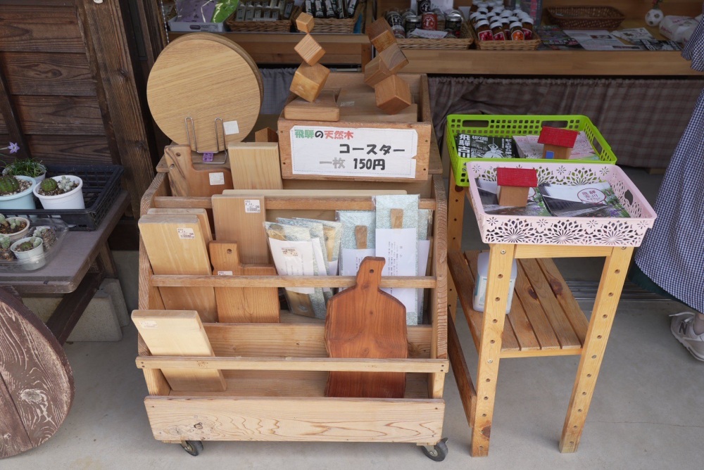 野菜以外のコーナーでは、飛騨の天然木を使ったコースターやまな板がお値打ちな価格で販売されており、見入ってしまいました。
