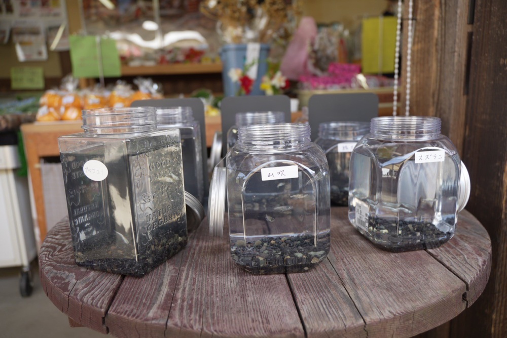 さらに、スズラン・ヤマブキと書いた水の入った入れ物を発見!花かな?と思ったらメダカでした。以前は気にしていなかったけれど、毎回ここにあった気がします。
