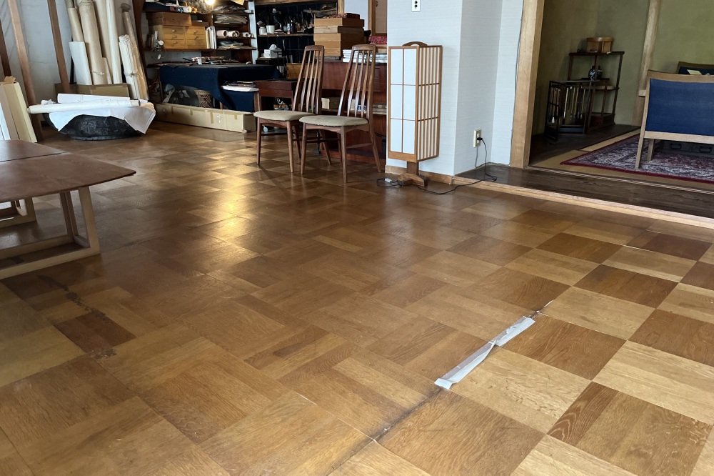 壁の傷や床の膨らみも再現。床には、桃紅自身が補修したガムテープも。