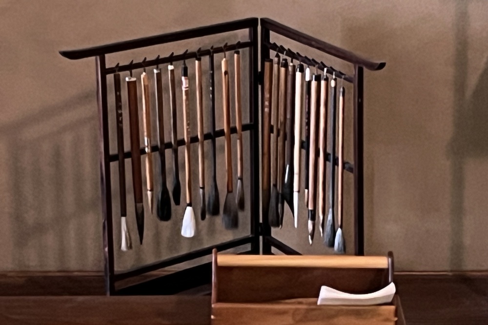 机の横には、愛用の大きな硯、筆や刷毛が200本以上並び、亡くなる3ヶ月前まで制作に没頭した2021年当時の様子が伝わってきます。