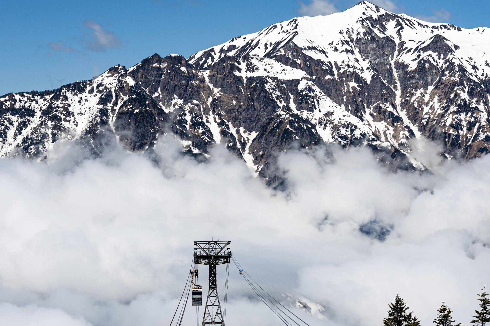 上写真は、雲海の中から姿を現した第2ロープウェイのゴンドラと、背後にそびえ立つ険しい岩肌の笠ヶ岳(標高2,898m)です。