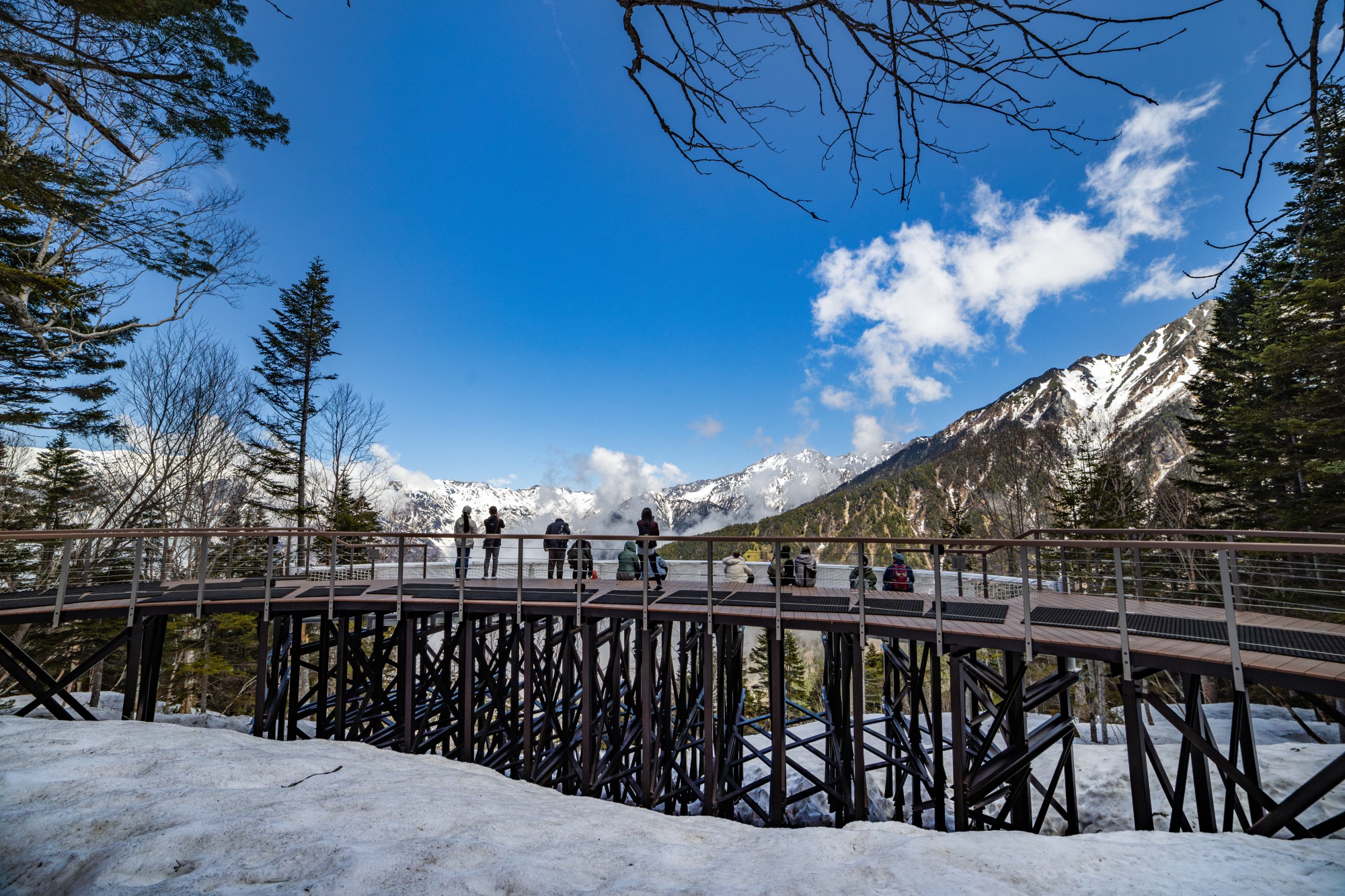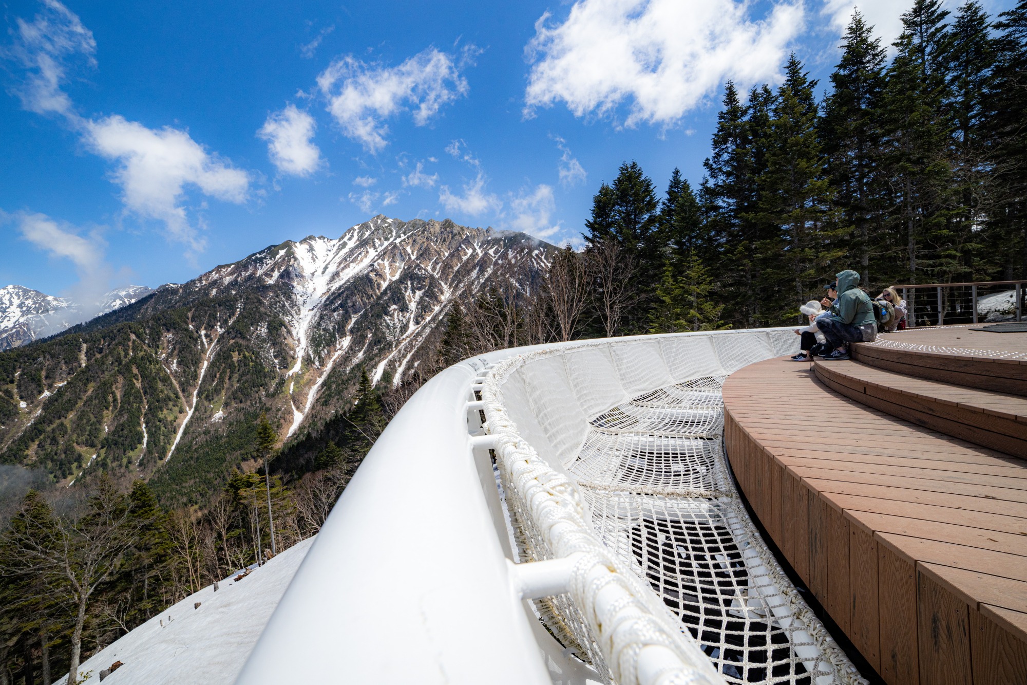 槍ヶ岳(標高3,180m)や穂高連峰などを望むことができる、ブーメラン型にせり出したデッキです。高所が平気な方は足元が網になっている手すり付近で絶景とスリルをお楽しみください(網の隙間から物を落とさないようご注意ください)。