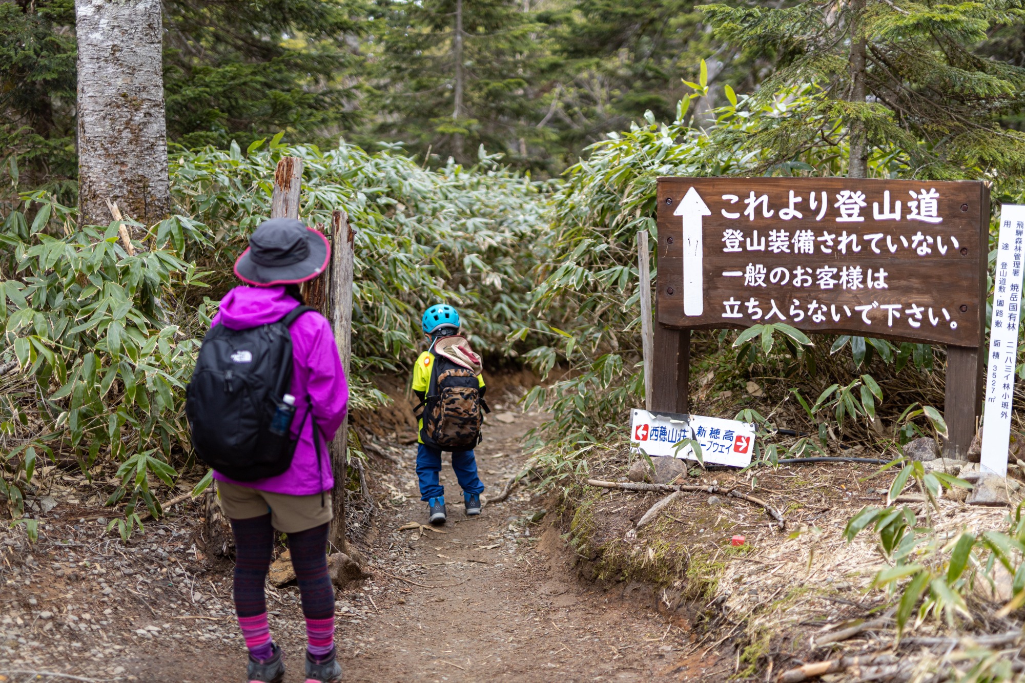 また、「頂の森」エリアをさらに奥へ進むと登山道があります。西穂山荘・西穂丸山・西穂独標などへ向かう方は登山装備を整え、登山届を提出してから登山をお楽しみください。(写真は息子6歳の時。西穂山荘でラーメンを食べてから西穂丸山まで登りました。)