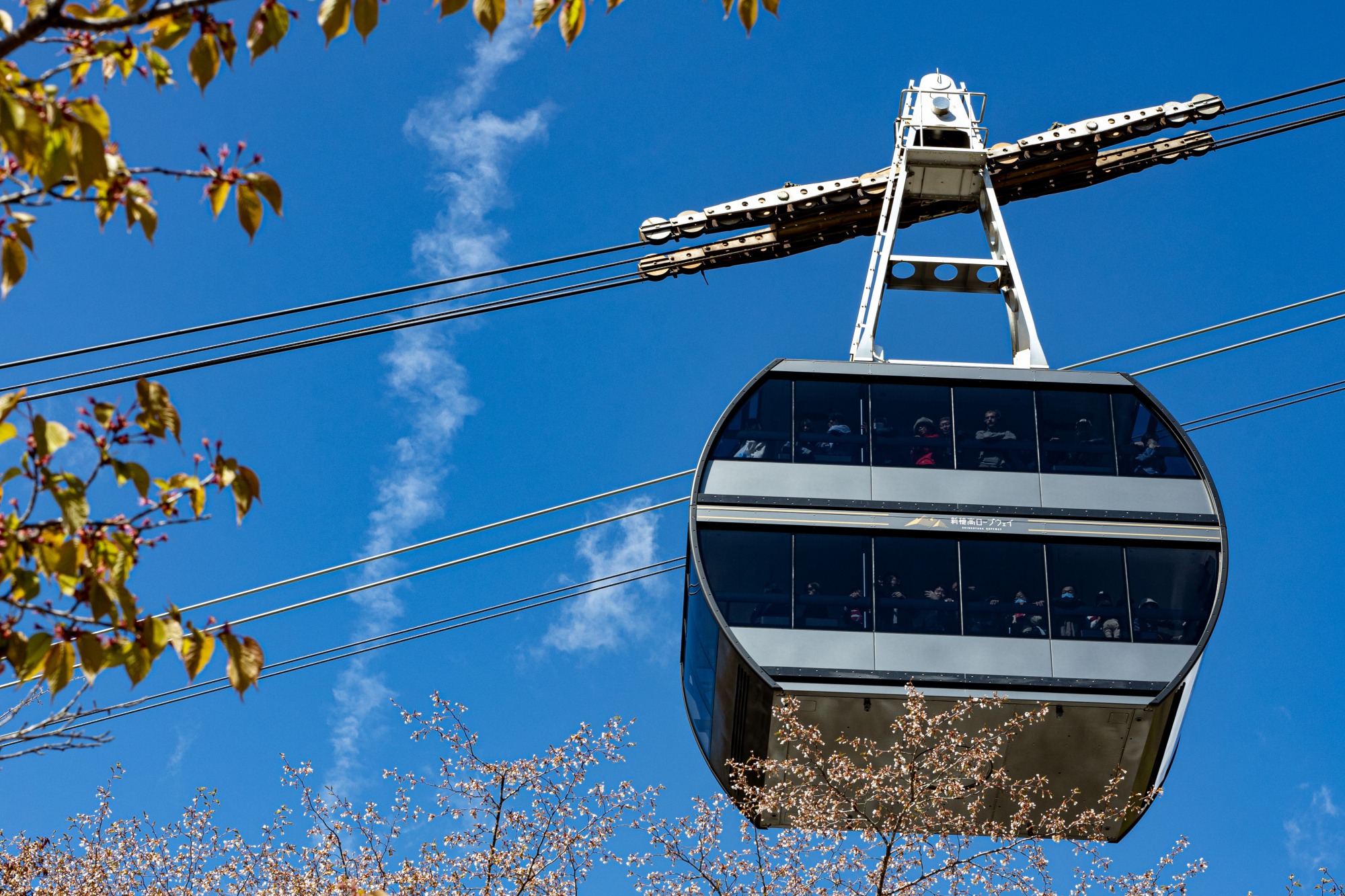 足湯付近からは、見上げるような形でロープウェイ通過を見ることができます。