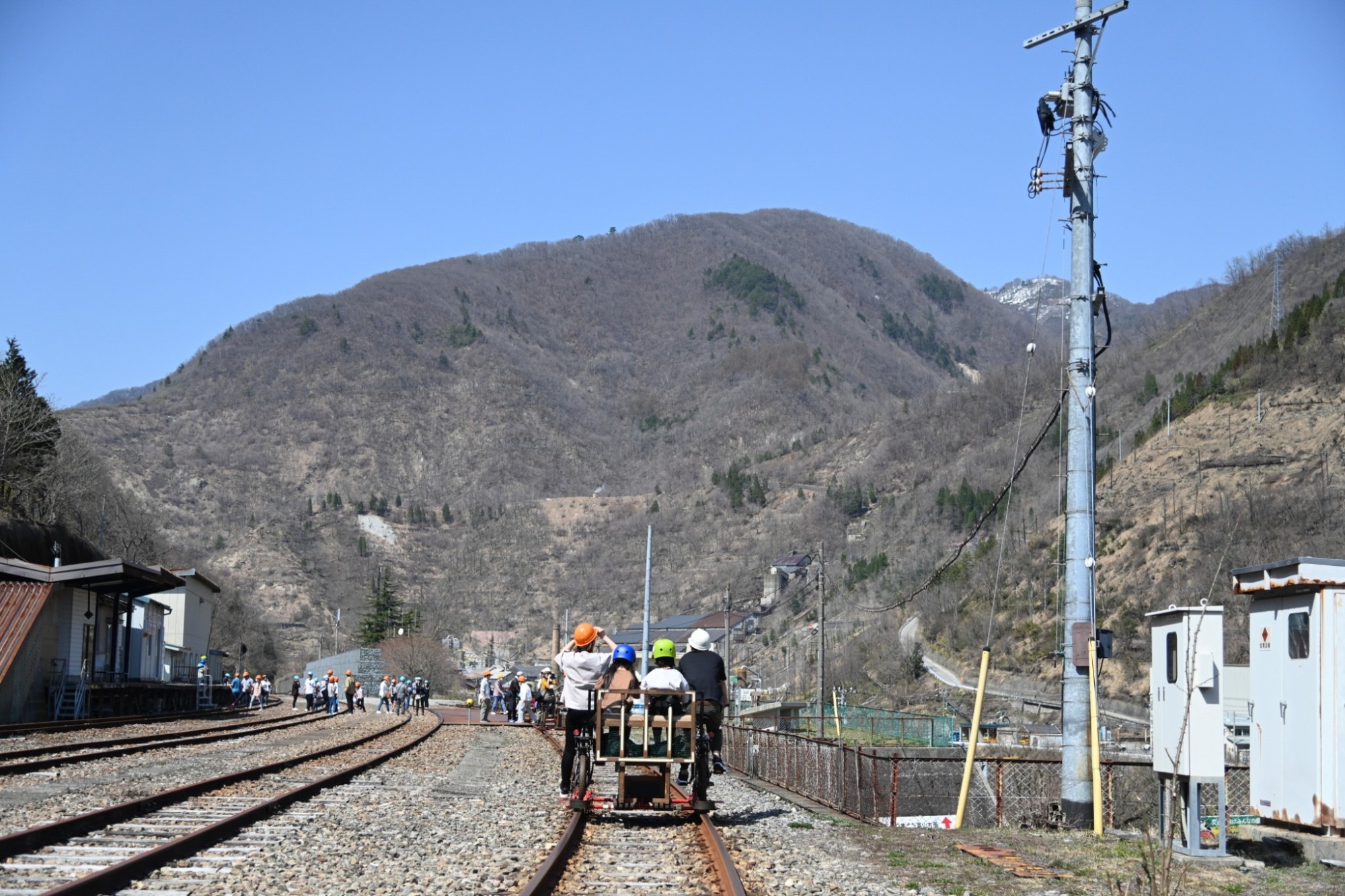 街並みを眺めながら漕ぎ進め、鉱山前駅に到着したら折り返しのために自転車から降りてしばし待機時間を過ごします。