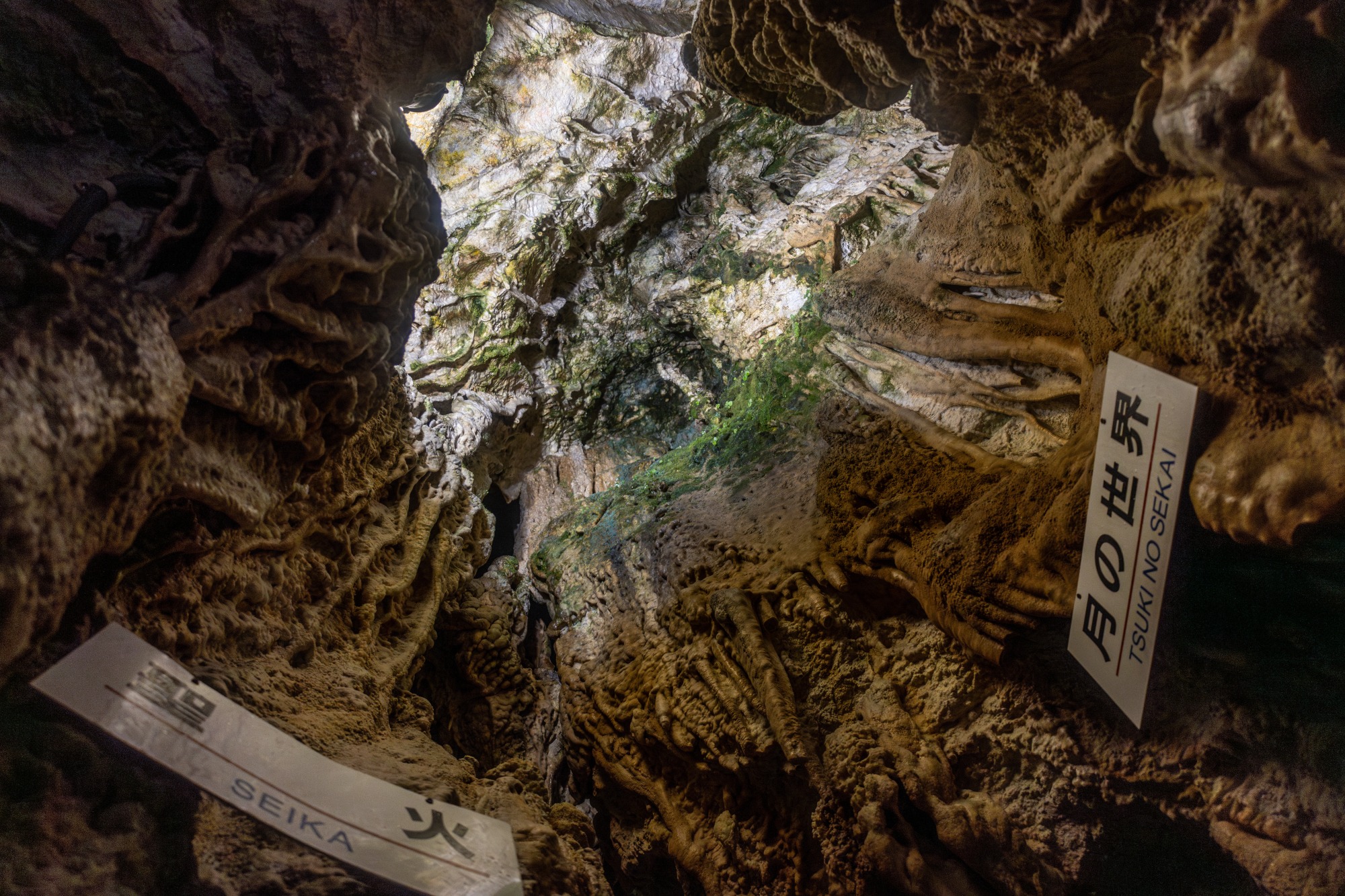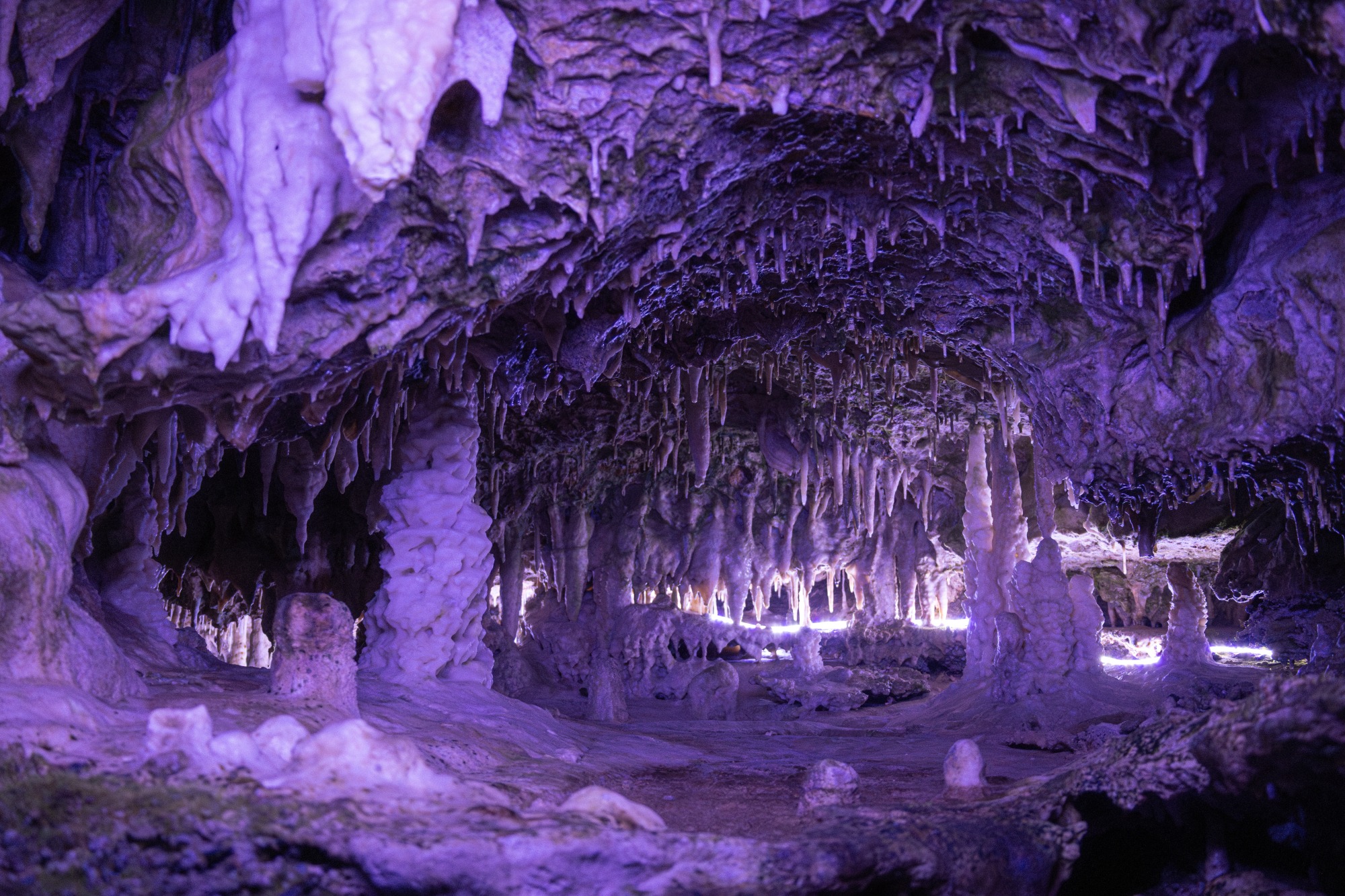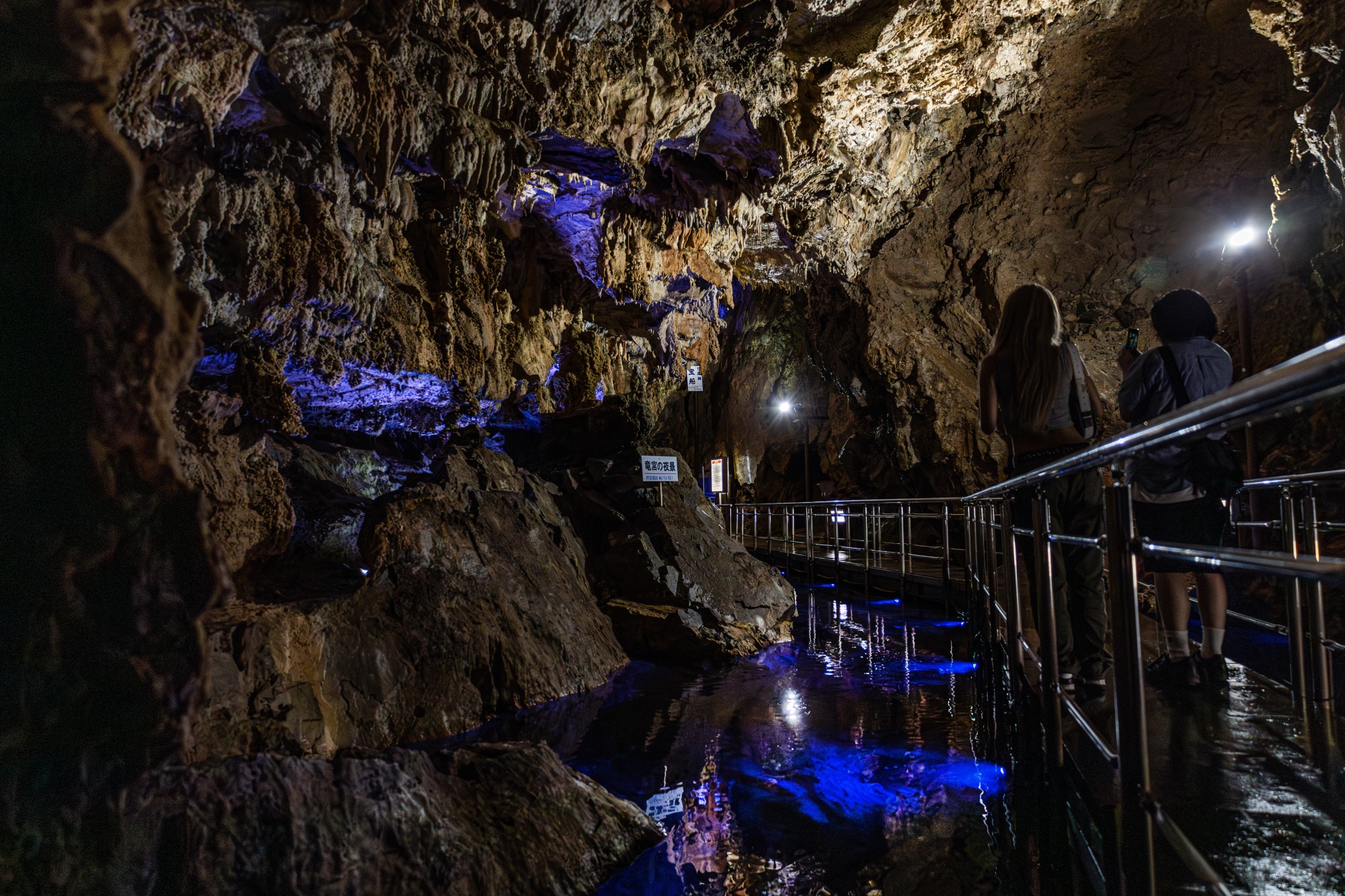 鍾乳石を傷つけないための青みがかったライトを頼りに、洞窟探検気分を味わえます(個人の感想です)。