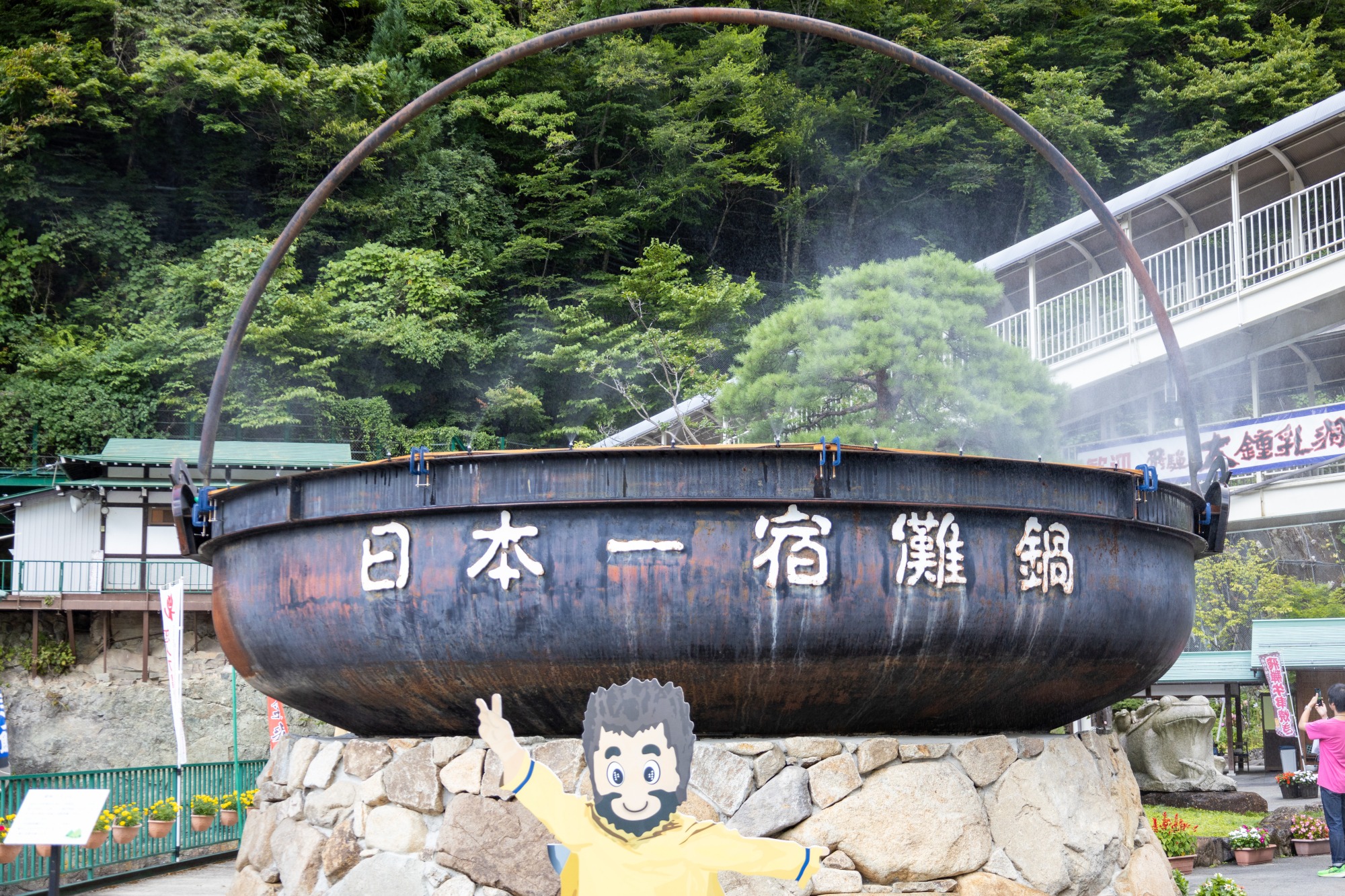 こちらは建物の外に設置されている、直径6mの「日本一宿儺鍋」。鍋のふちからはミストが出ているので、この付近にいると少し涼しく感じます。