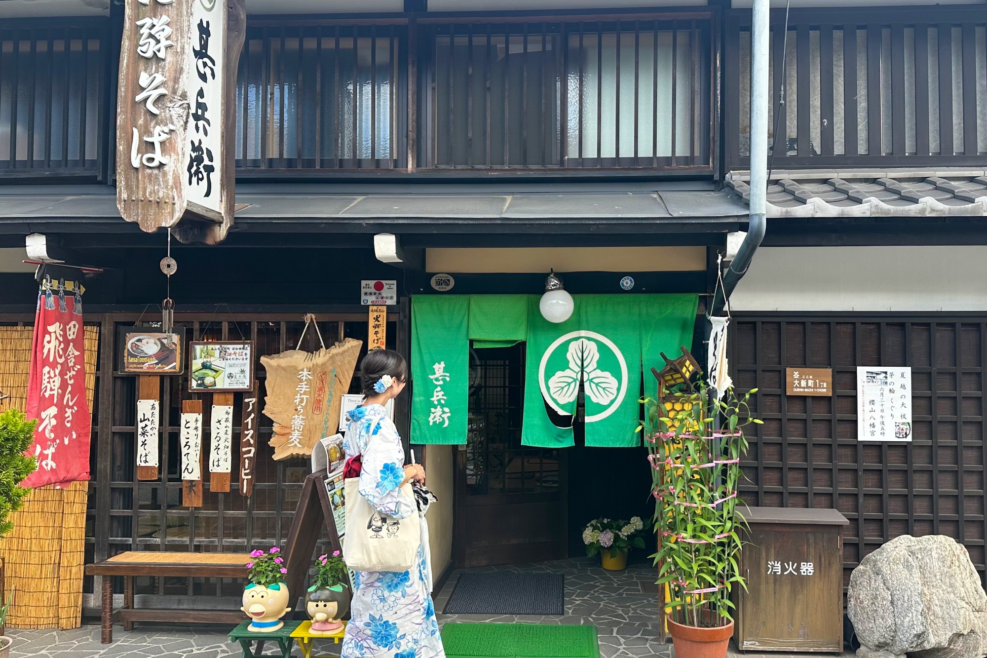 期間限定で「飛騨産生いちごかき氷」や「飛騨産生桃かき氷」を提供している「飛騨高山手打ち蕎麦 甚兵衛」は櫻山八幡宮の表通りにあります。