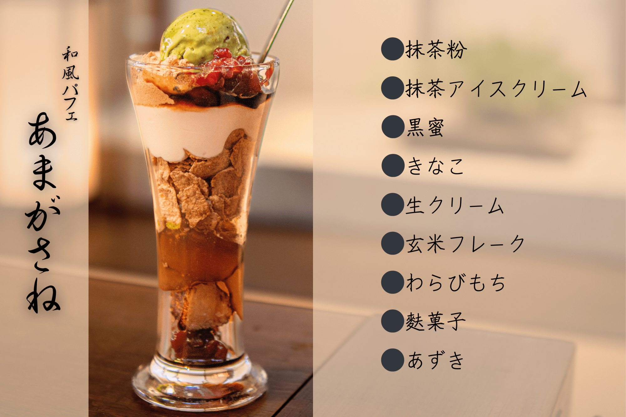 「わらびもち」単体でももちろんおすすめですが、筆者がよく注文するのが、わらびもちを使用した「あまがさね」というパフェ。