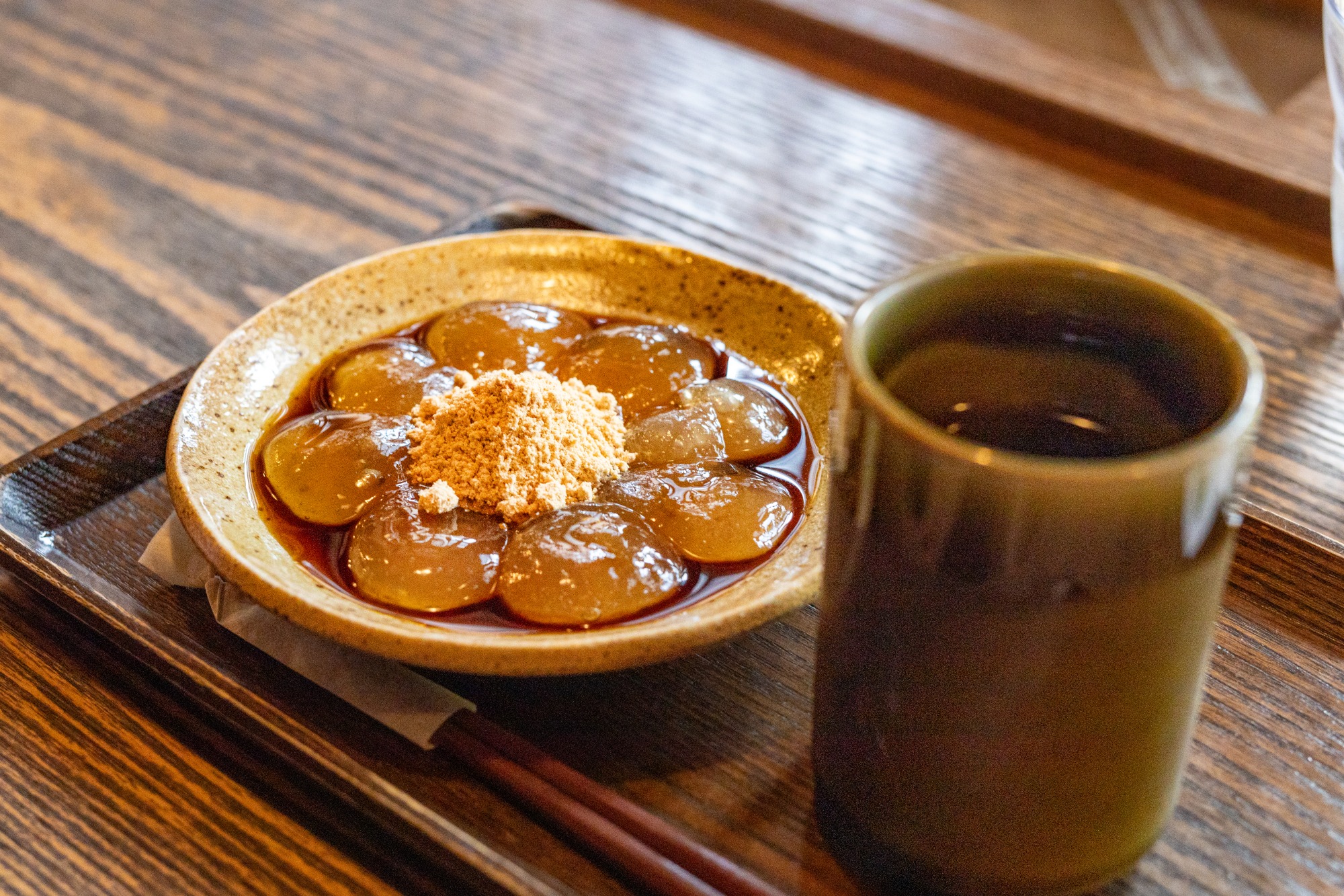 観光中心地「古い町並」内の和風モダンな喫茶店「喫茶去かつて」。メニューの中でも夏に食べていただきたいのが、かつて特製の「わらびもち」です。
