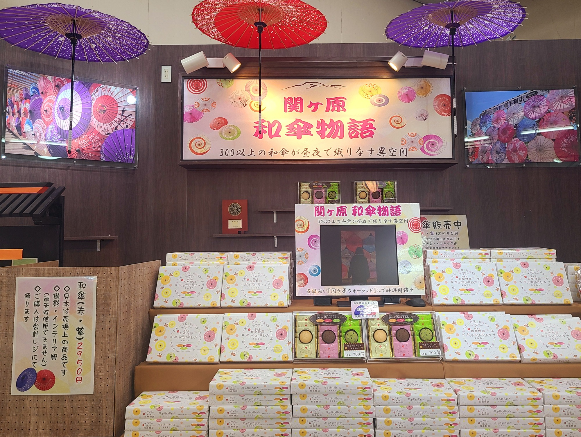 関ケ原 和傘物語にちなんだお土産コーナーは、和傘のディスプレイや灯り物語の写真も相まってひときわ目を惹きました!