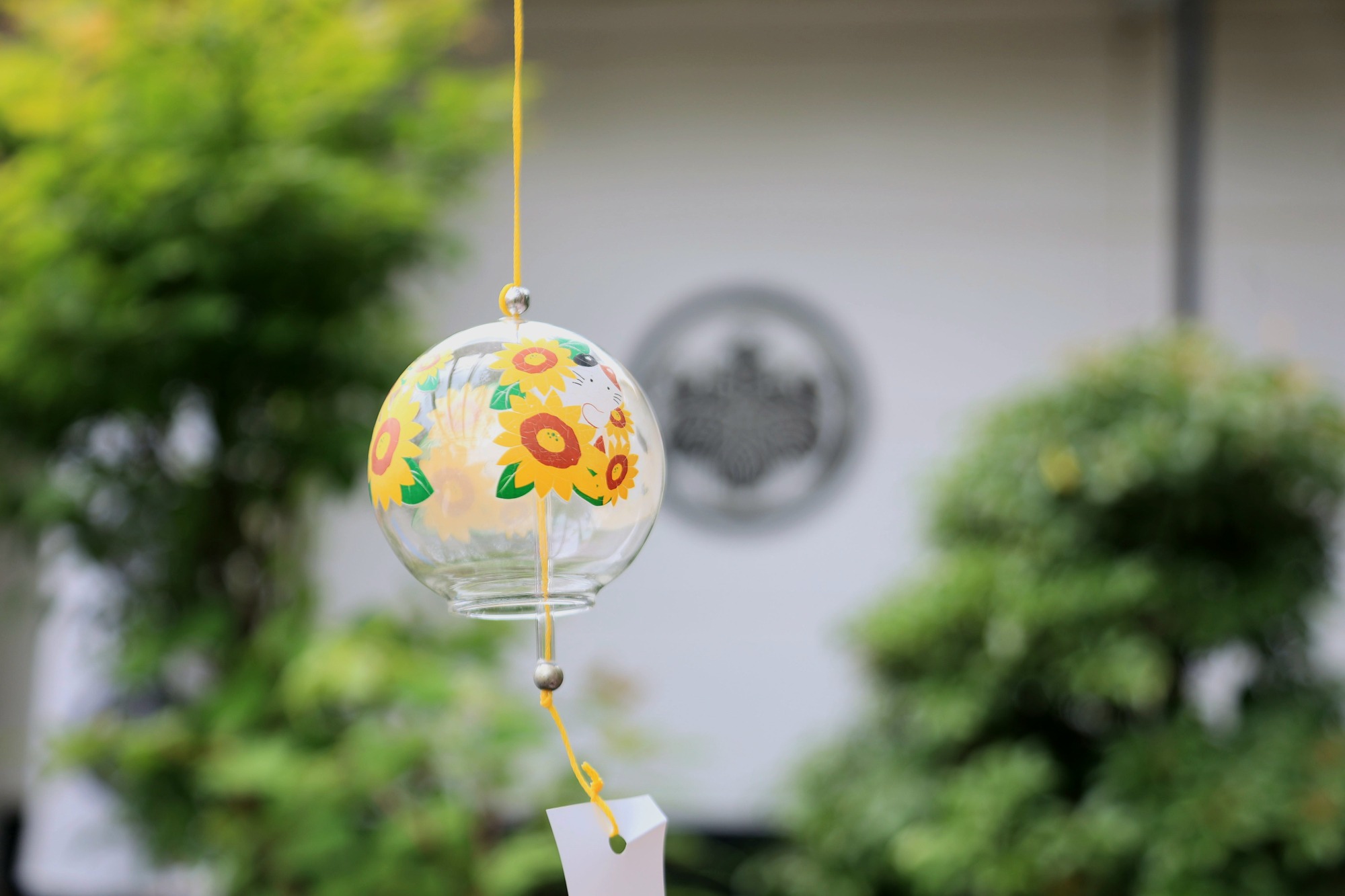 風鈴のもとは風鐸(ふうたく)。仏教の伝えで、風鐸の音が聞こえる範囲は災いから守られると信じられ、お寺のお堂の四隅に吊るされていました。平安時代になると魔除けとして軒先に吊るされ「風鈴」と呼ばれるようになりました。