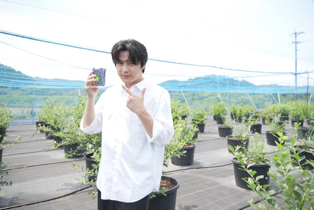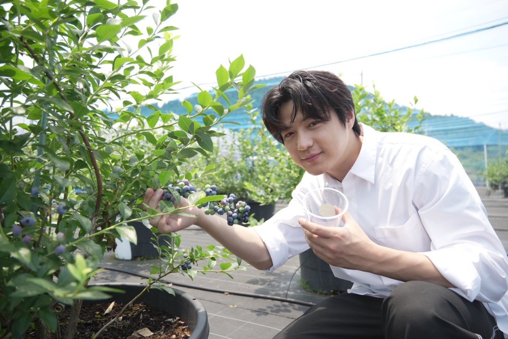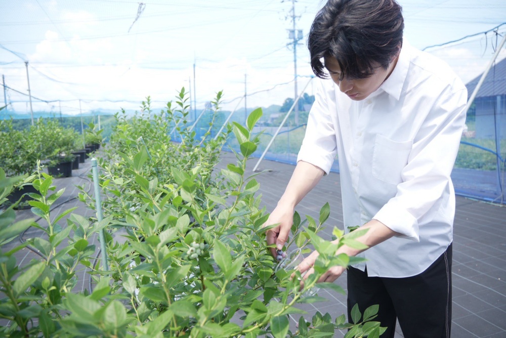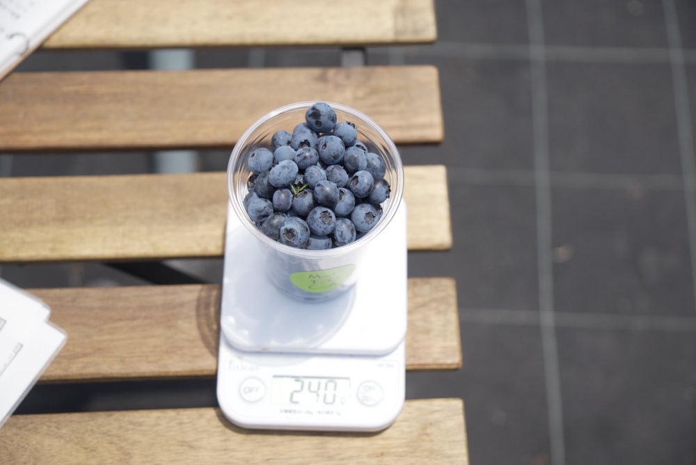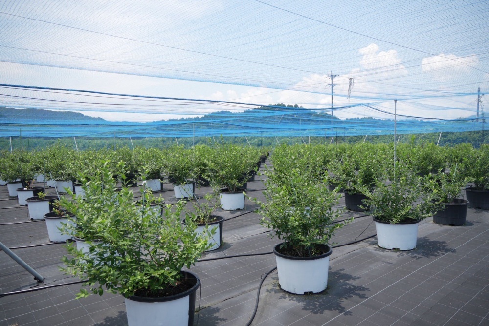 ブルーベリーの品種は6種類あり、約250本の木が栽培されています。鳥などに食べられないよう大きな網の中に木が設置されていて、実を摘み取ってカップの中に入れていきます。