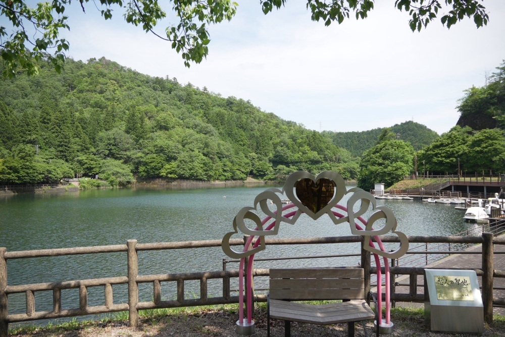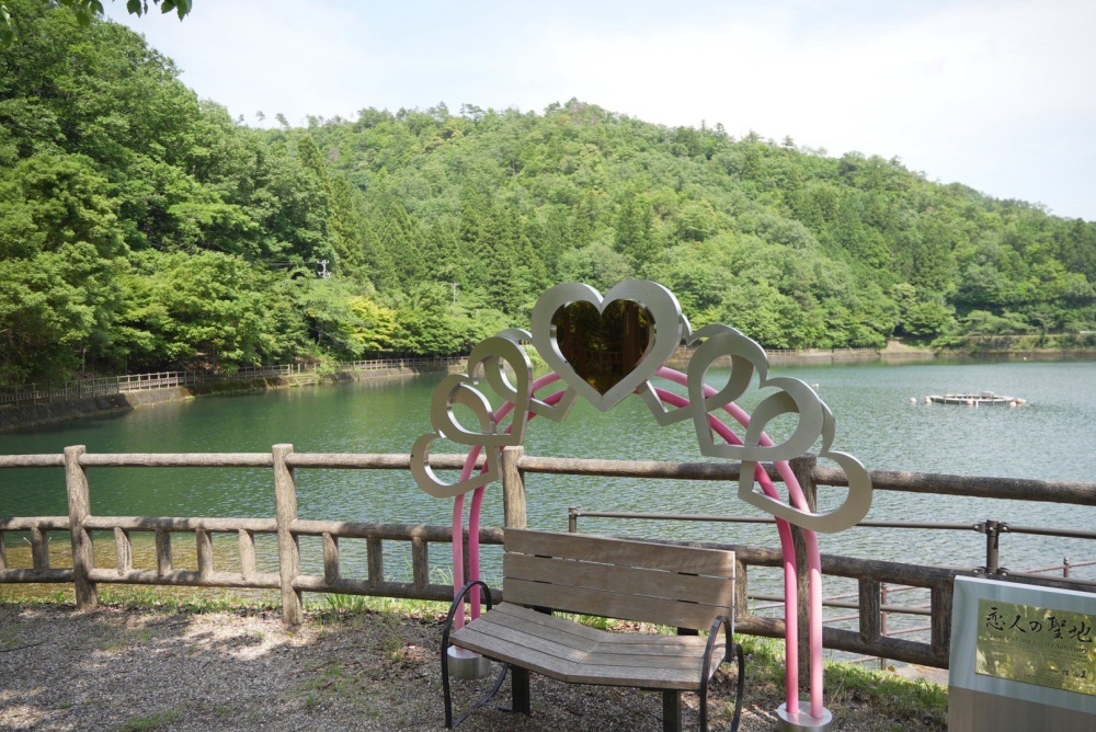 今回は、湖をバックに撮影スポットでもあるハートのモニュメントを写してみました。ベンチに座って撮影できるようになっているので、カメラを構えてみると「あれ?ベンチが壊れてる?」