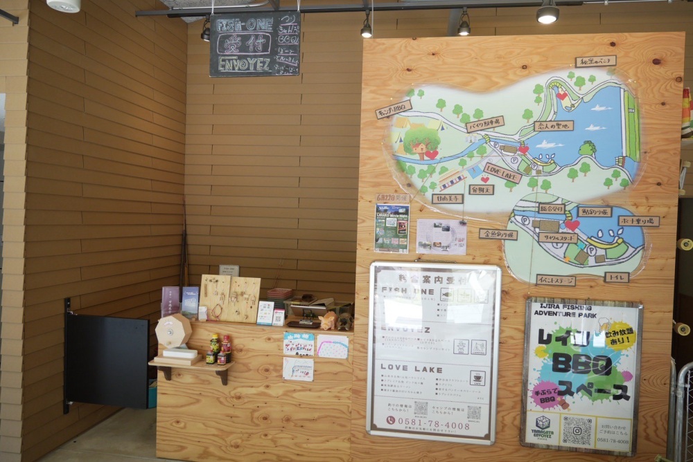 わかさぎ釣りやボートに乗れる「FISH ONE」、BBQや鮎釣りが楽しめる「伊自良湖 FISING&ADVENTURE PARK」、キャンプができる「アンバイエ」、カフェ「ラブレイク」。