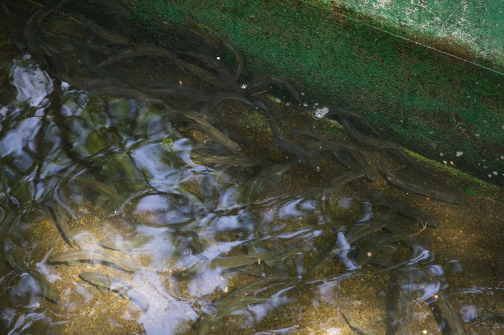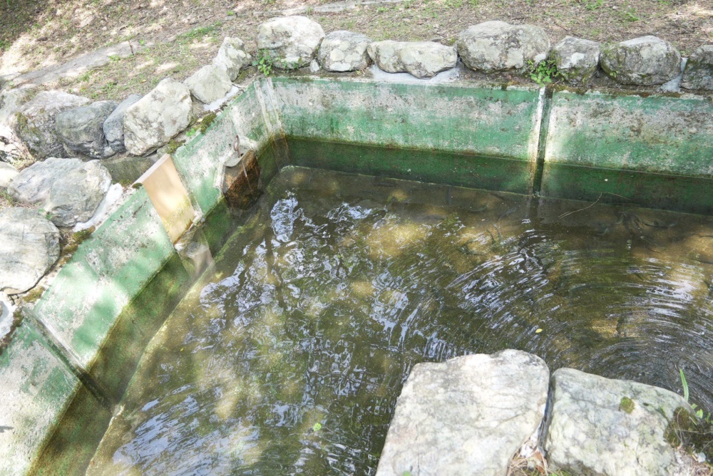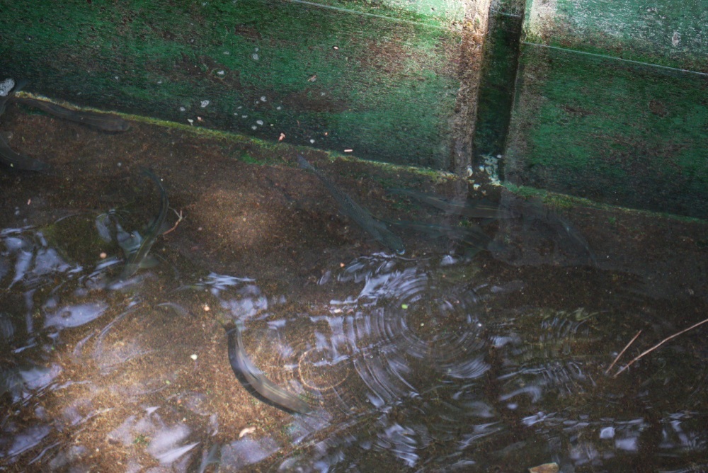 建物横にある少し深い石でできた釣り堀には鮎がたくさん入っており、引っかけ釣りをします。