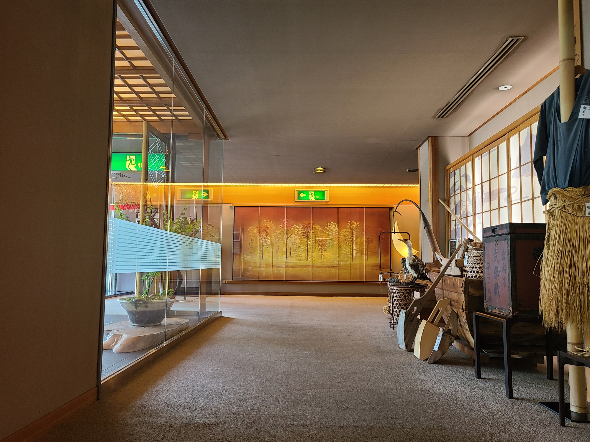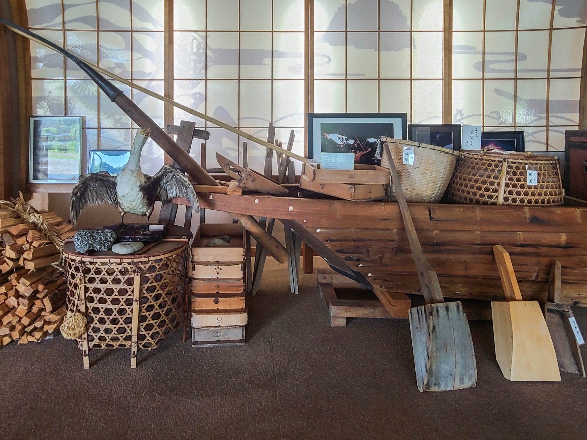 エントランスの通路には、鵜飼に使用されている道具や鵜飼用具が展示されています。