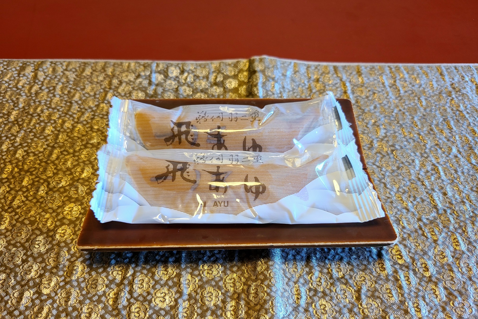 鮎菓子。やわらかいカステラ生地で求肥を包み長良川の鮎の形をイメージした昔ながらの素朴な味わいのお菓子です。