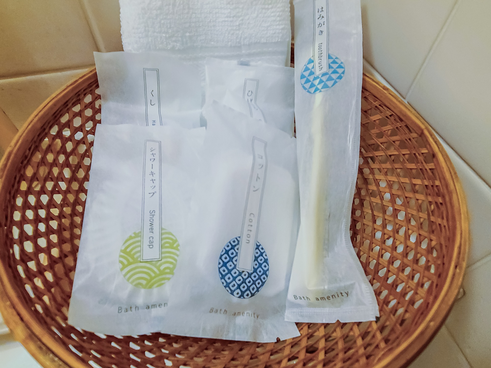 フェイスタオル、歯ブラシ、くし、ひげそり、シャワーキャップ、コットンなどのアメニティ類は部屋の洗面所に用意されていました。