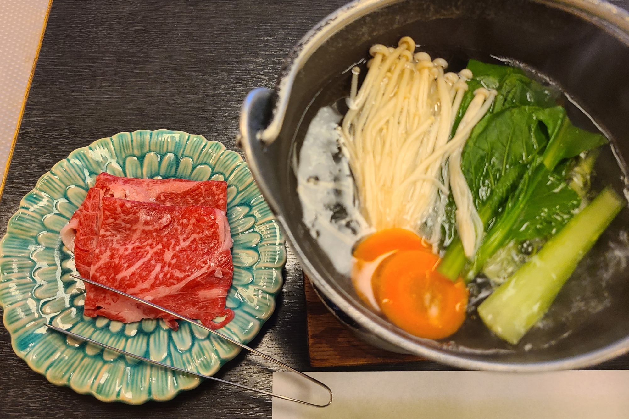 飛騨牛のしゃぶしゃぶ。えのき、小松菜、人参、葛切り、美女餅など具材もたっぷり!さっぱりポン酢でいただくので食が進みます。