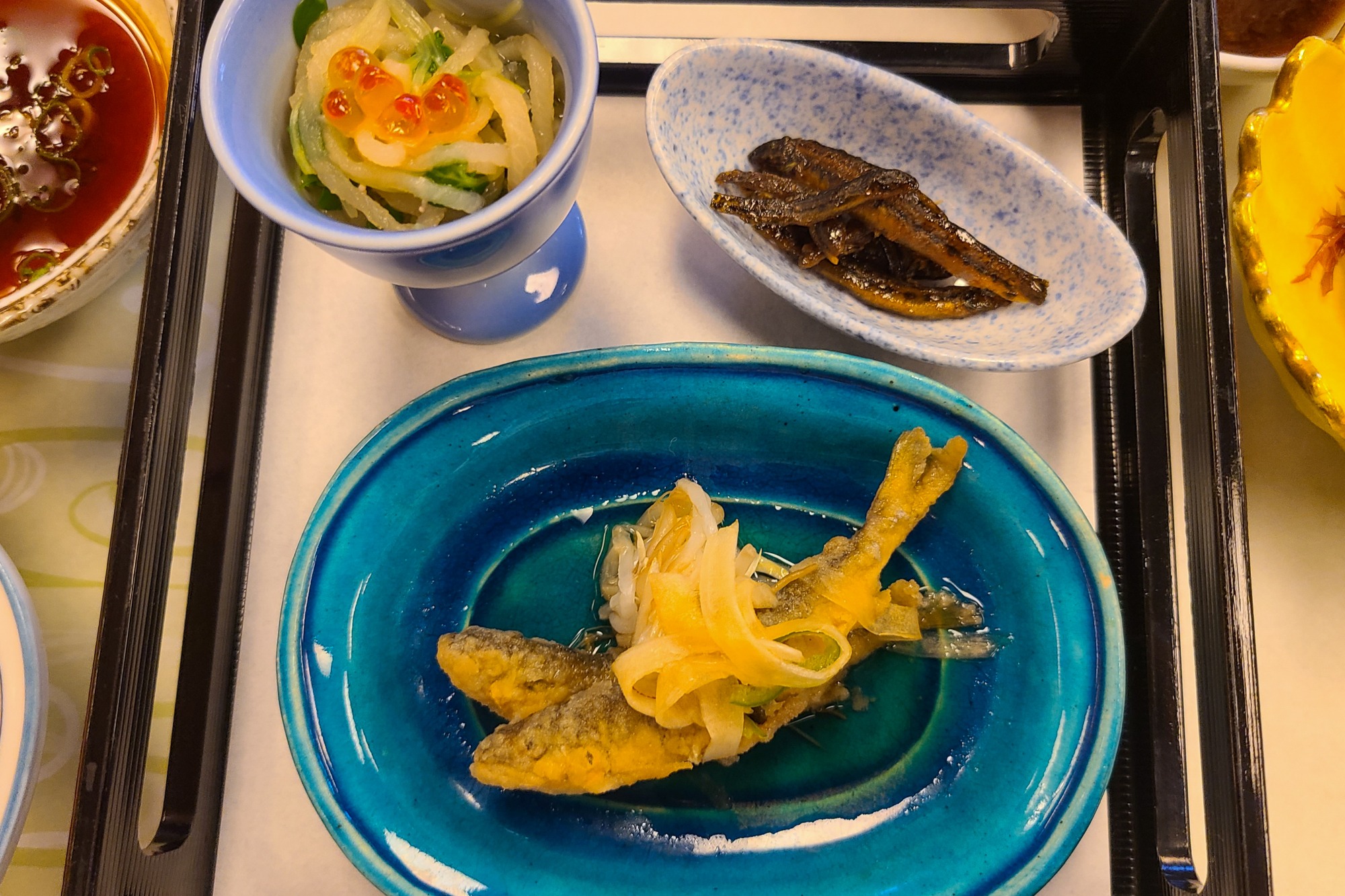 縞どじょう佃煮、小鮎の南蛮漬け、貝割大根したし